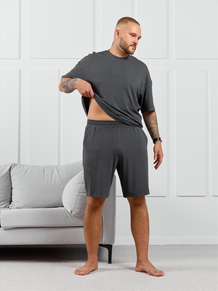 Шорты мужские из пластичного однотонного трикотажного полотна в рубчик, приятного к телу. Модель свободная, с боковыми карманами с обтачными входами, на притачном поясе с отстроченной эластичной тесьмой.