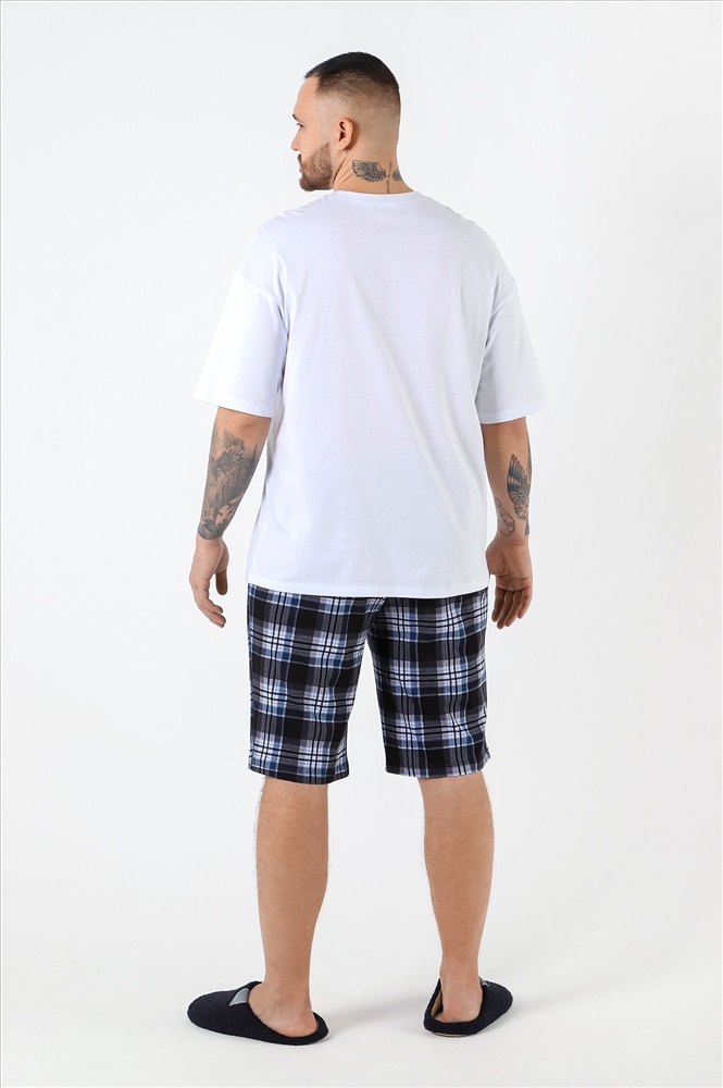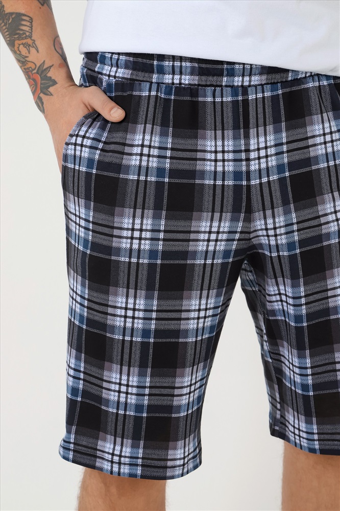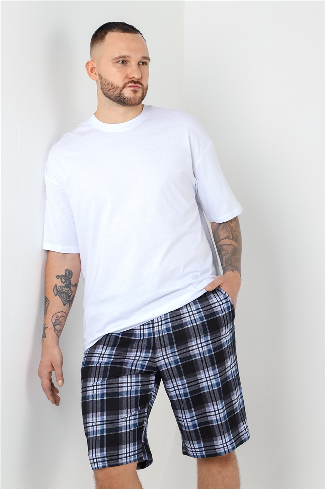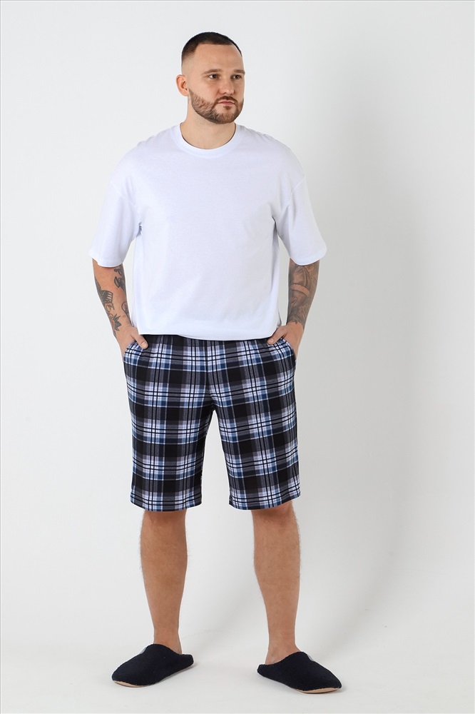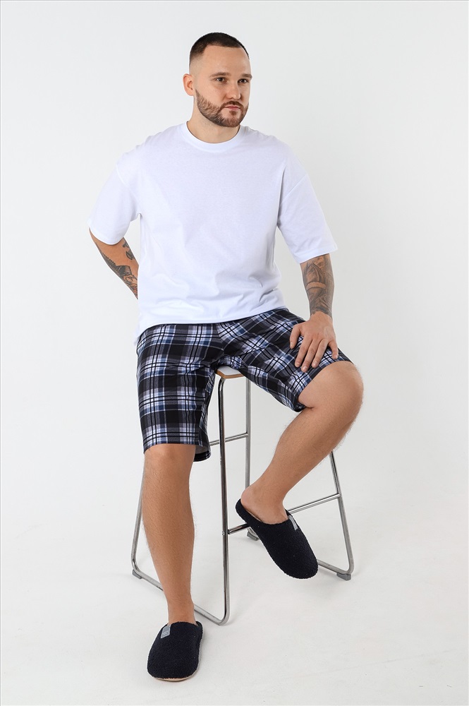 Шорты мужские из трикотажного полотна "кулирка" с набивным рисунком, удлиненные, на притачном поясе с эластичной тесьмой внутри, с карманами в боковых швах, входы в которые окантованы основным материалом.