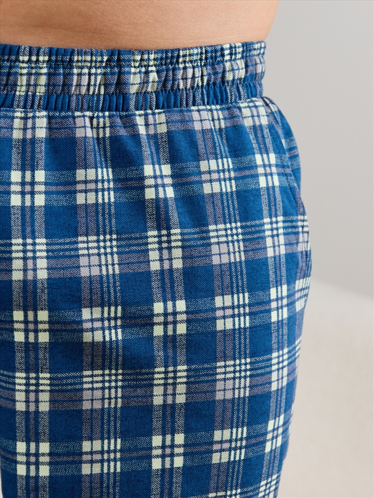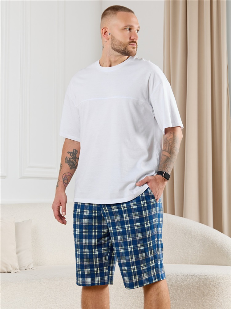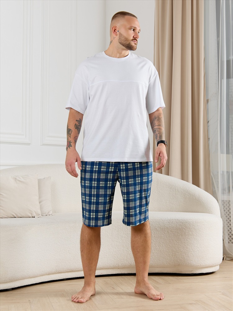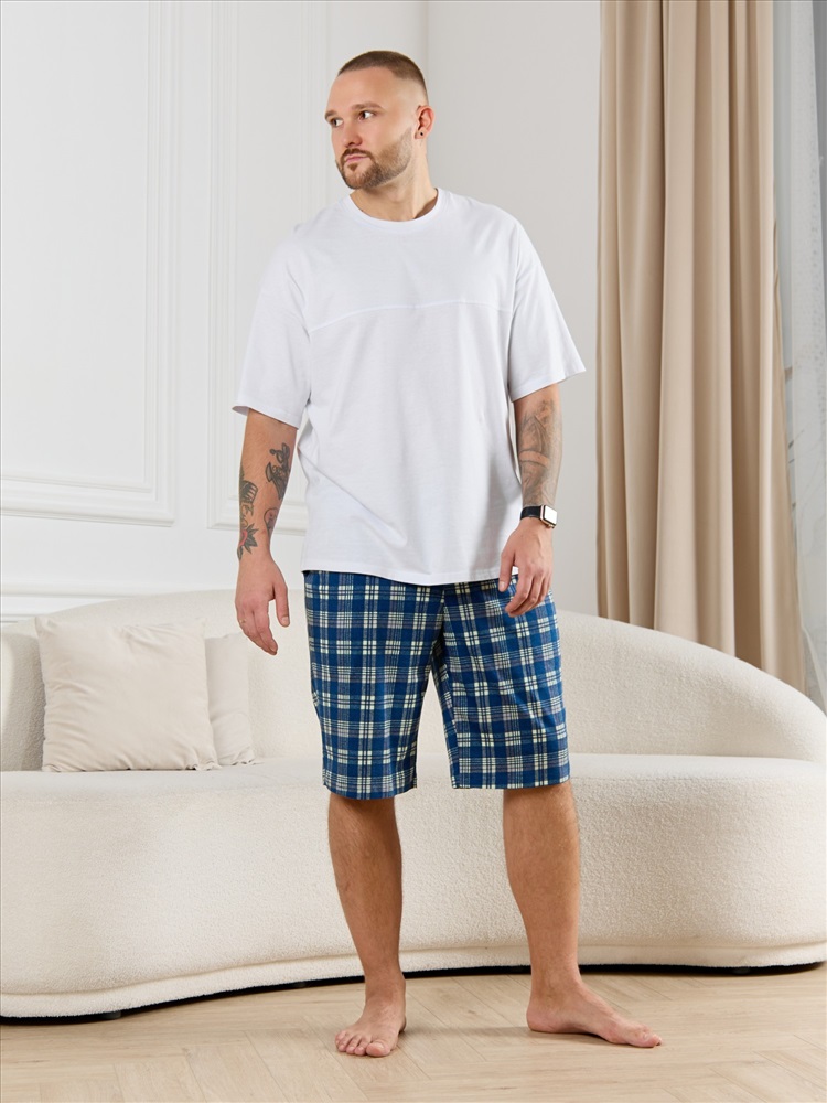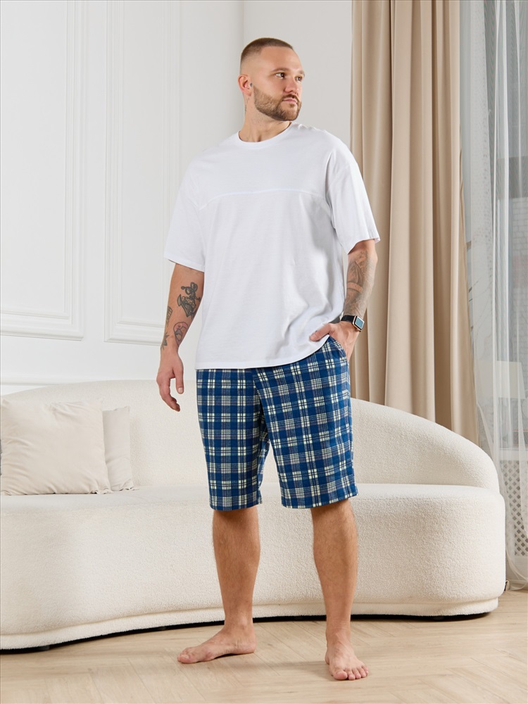 Шорты мужские из трикотажного полотна "кулирка" в клетку, свободного покроя, на притачном поясе с эластичной тесьмой внутри, с карманами в боковых швах. Нижние срезы обработаны подгибкой.