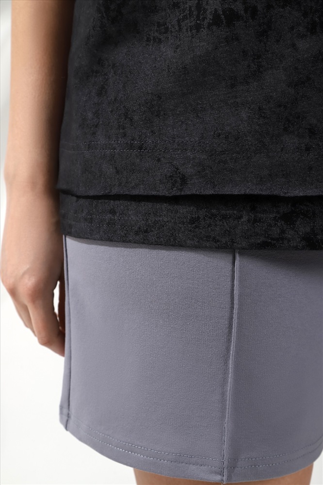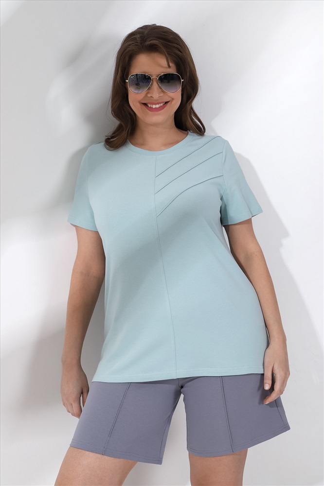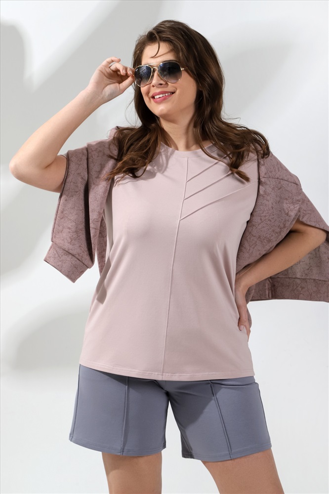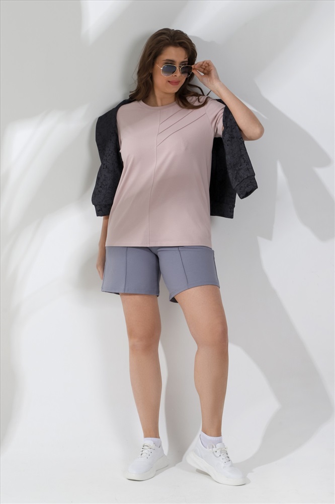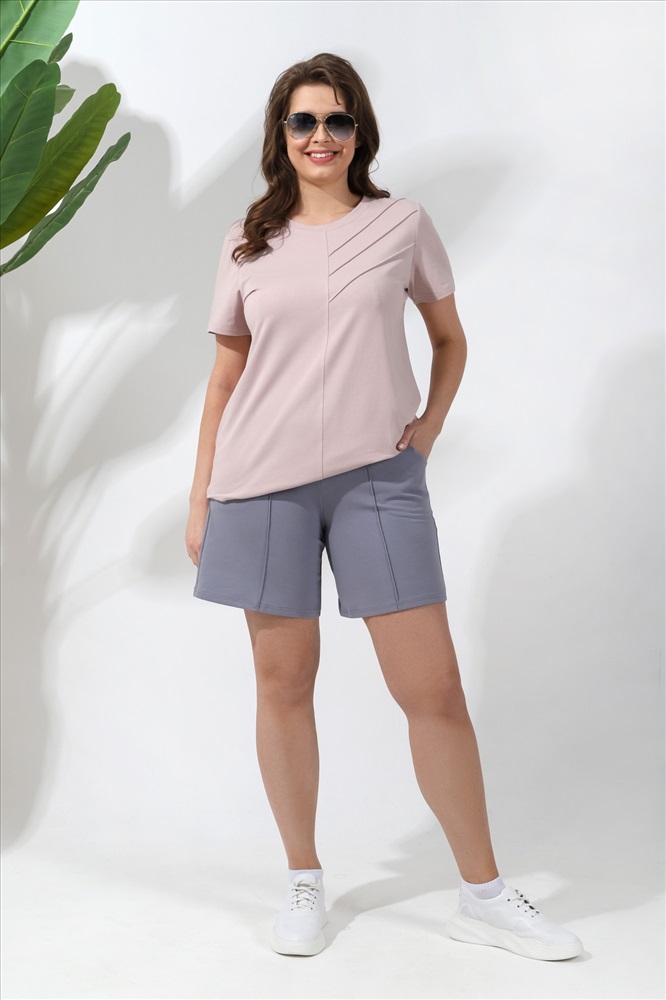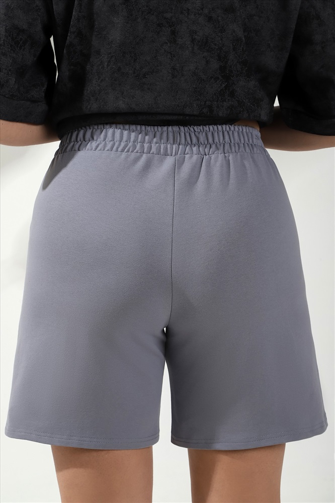 Шорты женские из гладкокрашеного трикотажного полотна «футер-двунитка», удлиненные и расширенные, на притачном поясе с эластичной тесьмой внутри и карманами в боковых швах. Передние половины шорт застрочены по центральным линиям.
