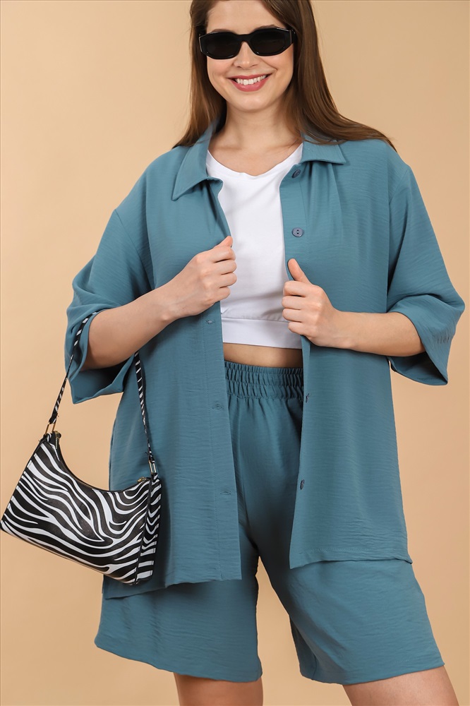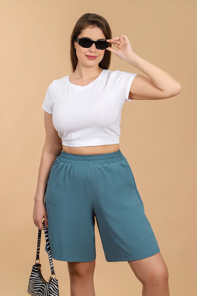 Шорты женские из тканого гладкокрашеного полотна «Лен Манго», свободного покроя средней длины, с карманами в боковых швах, на притачном поясе с эластичной тесьмой внутри.