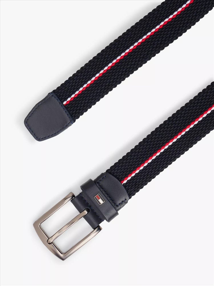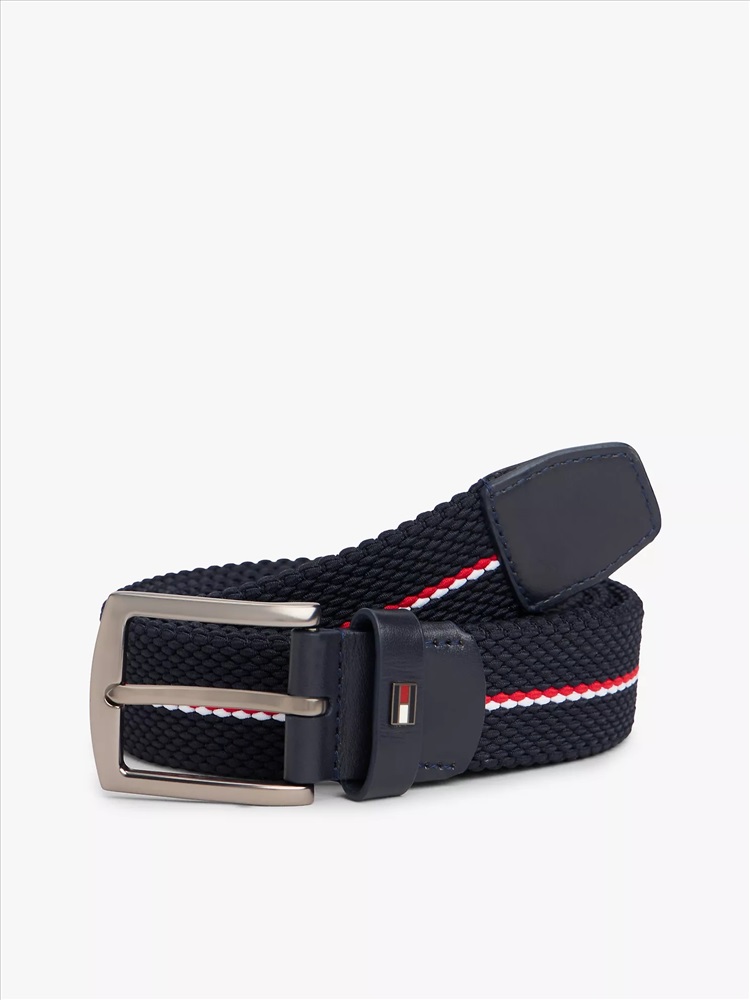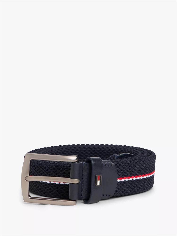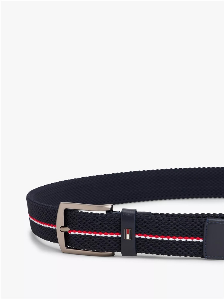 Tommy Hilfiger men's belt. Show some brand love with this signature stripe belt, made from stretchy elastic weave that adds texture to your look.