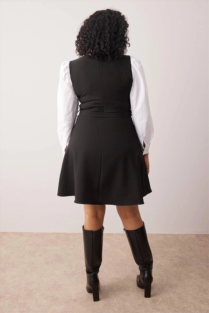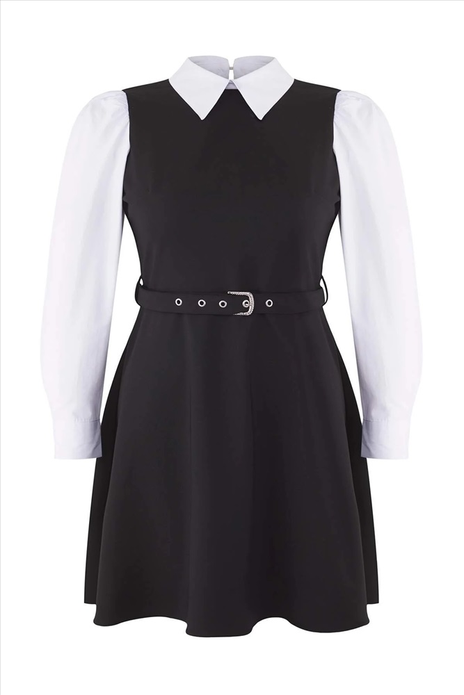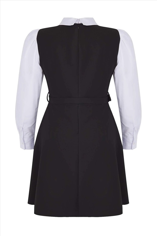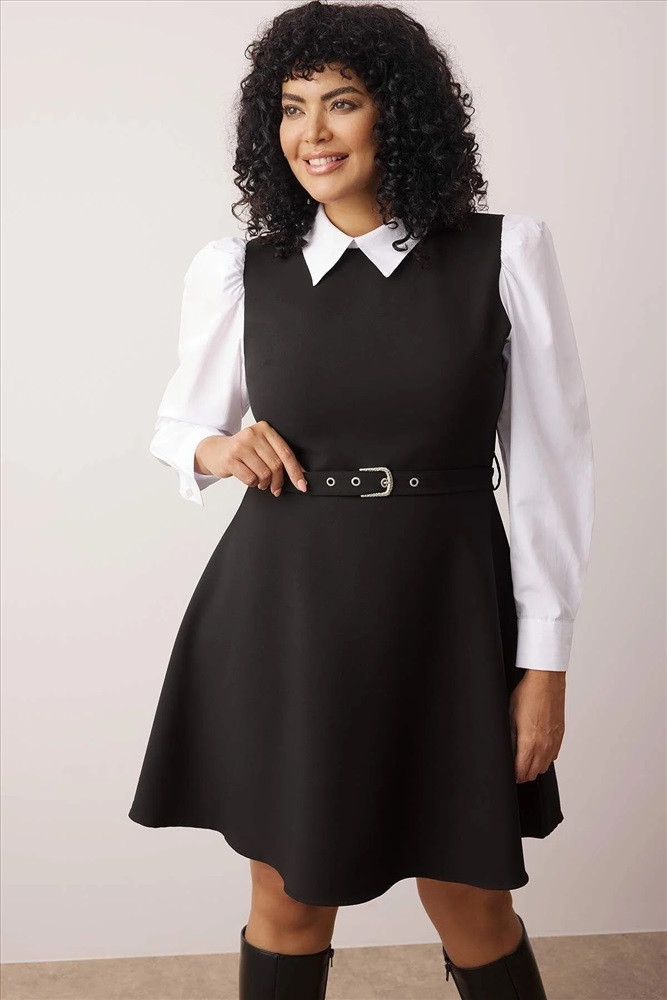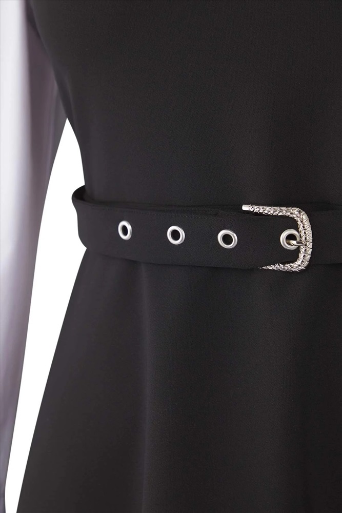 Siyah Kemerli Belden Açılan Gömlek Detaylı Mini Dokuma Elbise TBBAW26AH00038