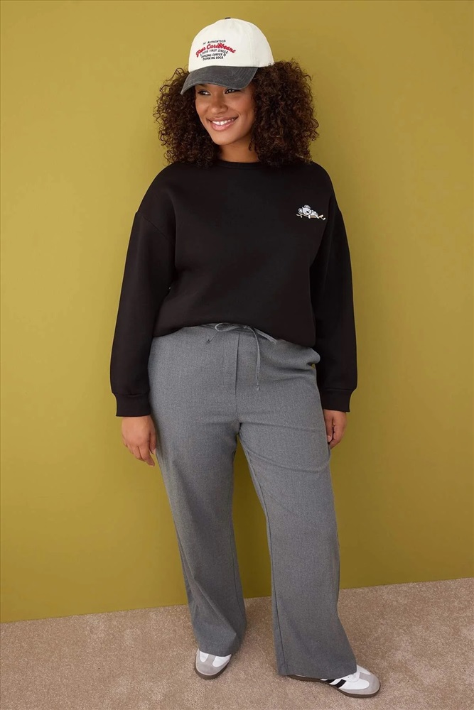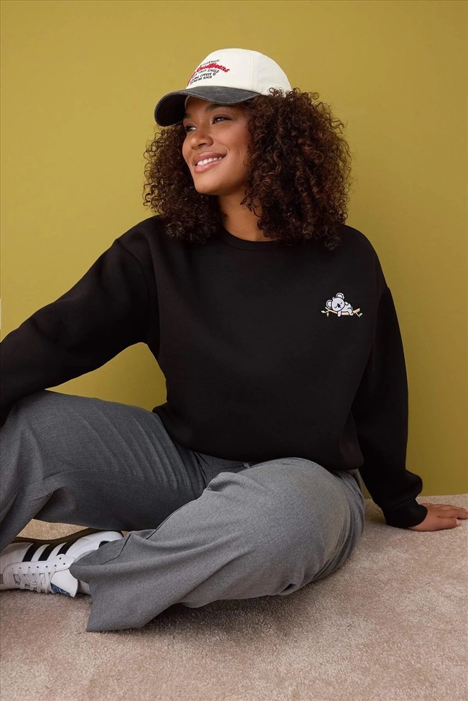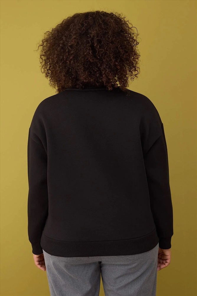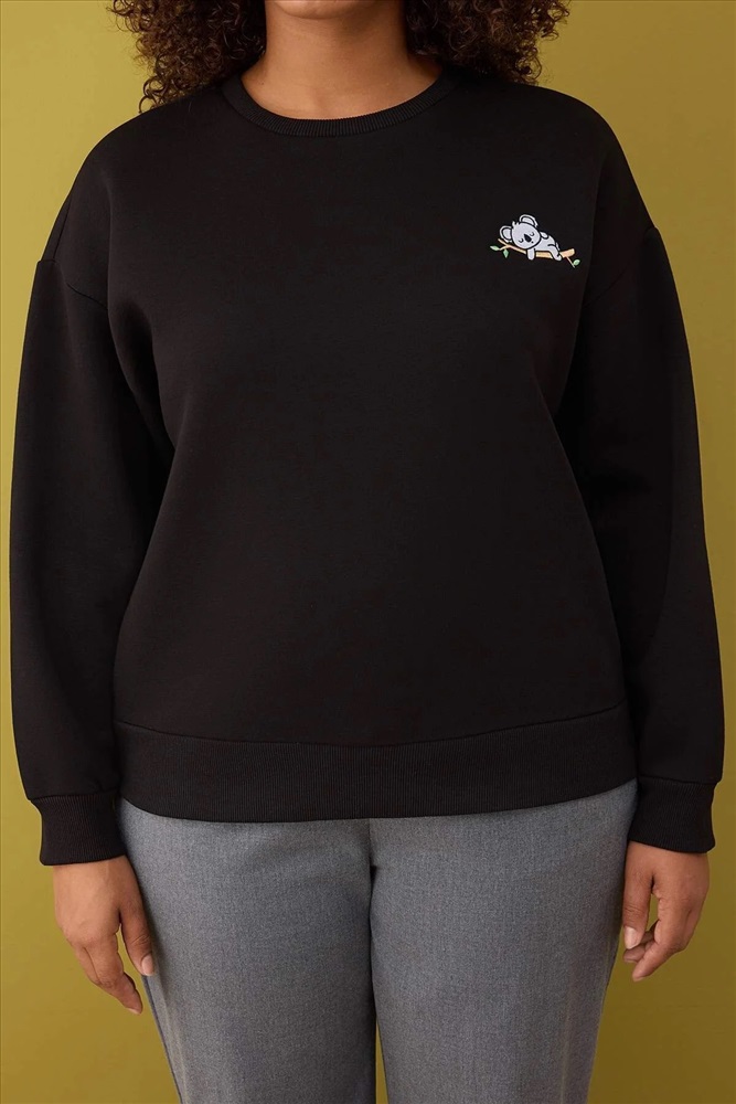 Siyah Animal Nakışlı Regular Kalın İçi Polarlı Örme Büyük Beden Sweatshirt TBBAW26AO00006