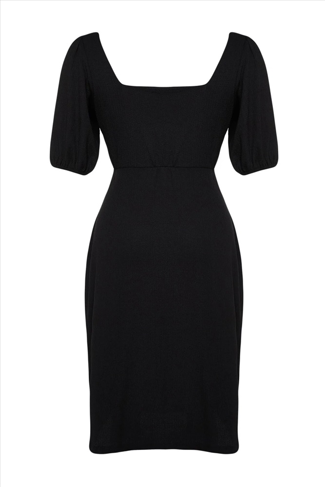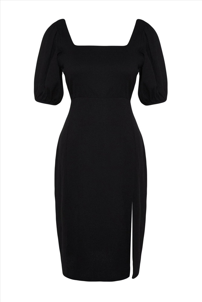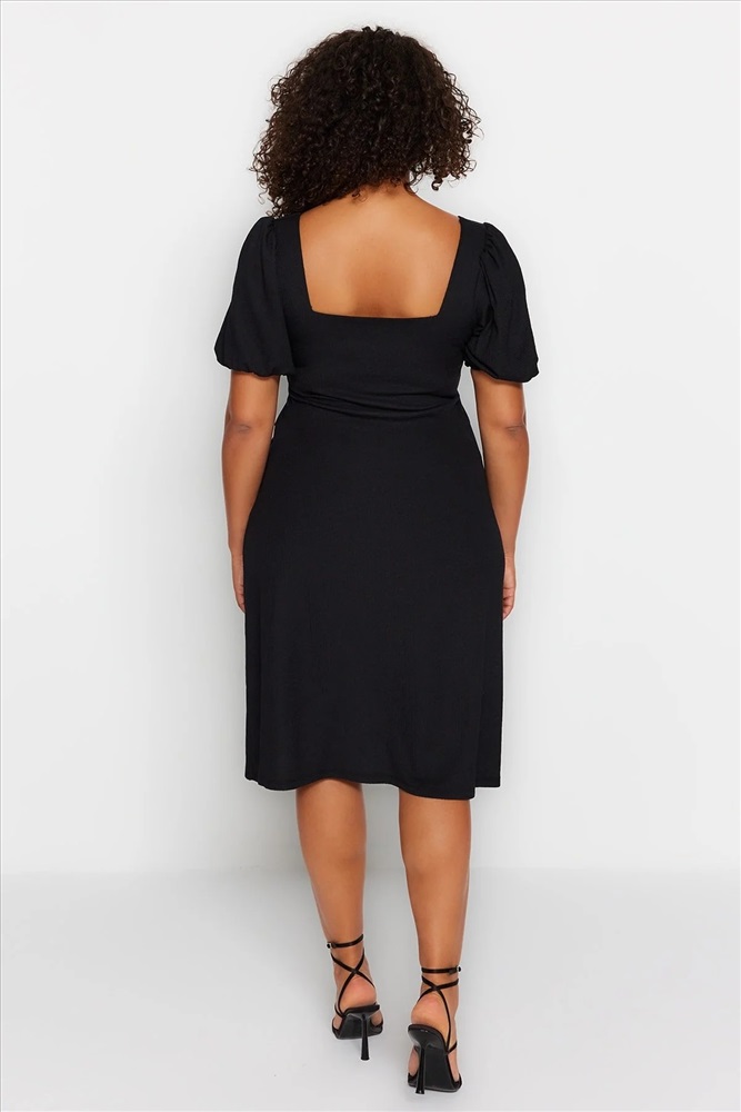 Siyah Balon Kol Kare Yaka Yırtmaçlı A-Line Büyük Beden Örme Elbise TBBSS23AH00280