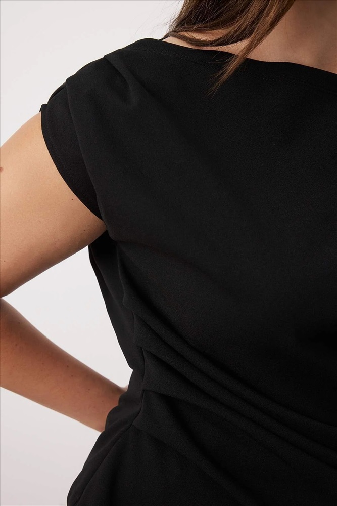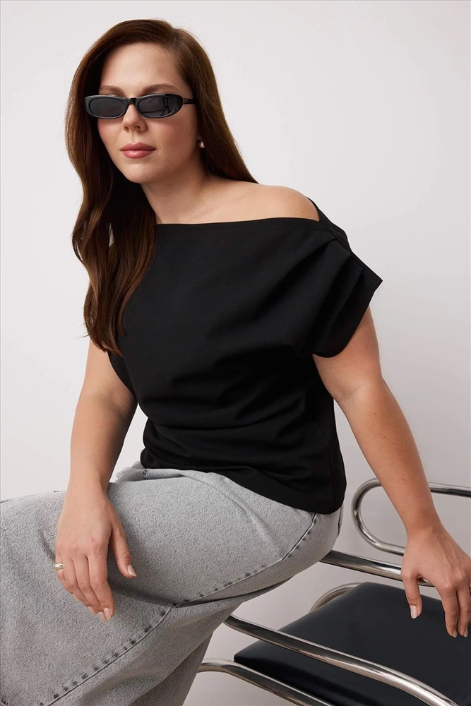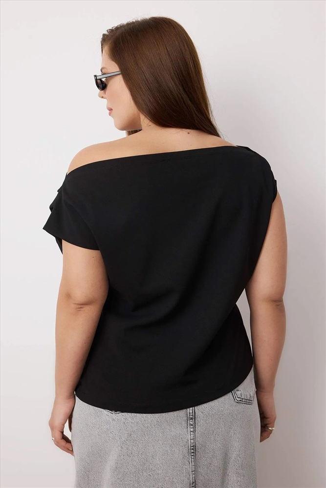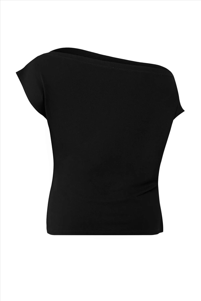 Siyah Büzgü/Drape Detaylı Dökümlü Asimetrik Yaka Örme Bluz TBBSS25AF00119