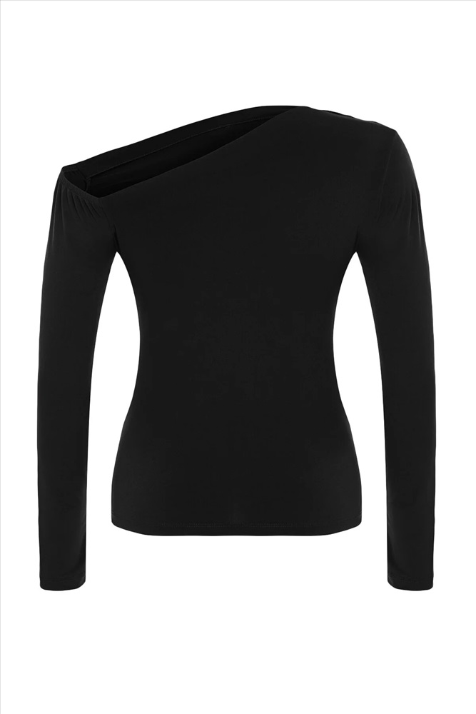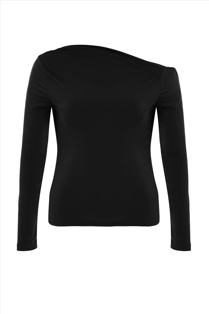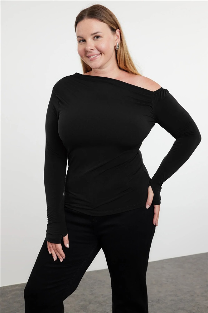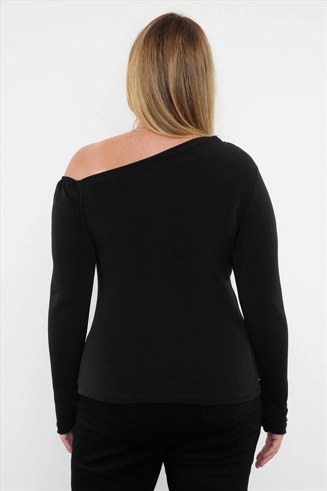 Siyah Büzgülü Tek Omuz Örme Büyük Beden Bluz TBBAW25AF00013