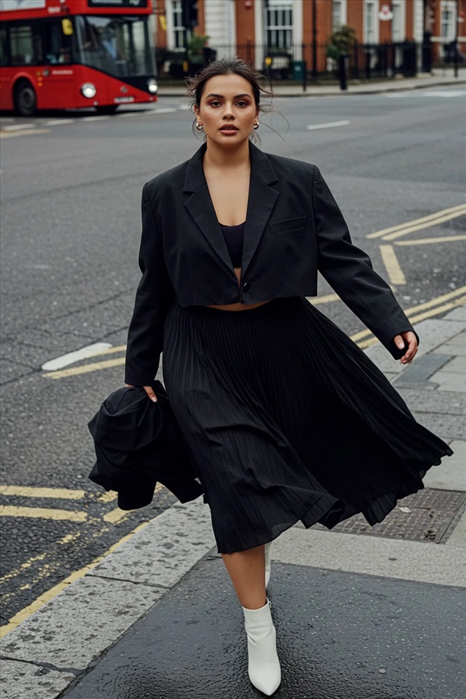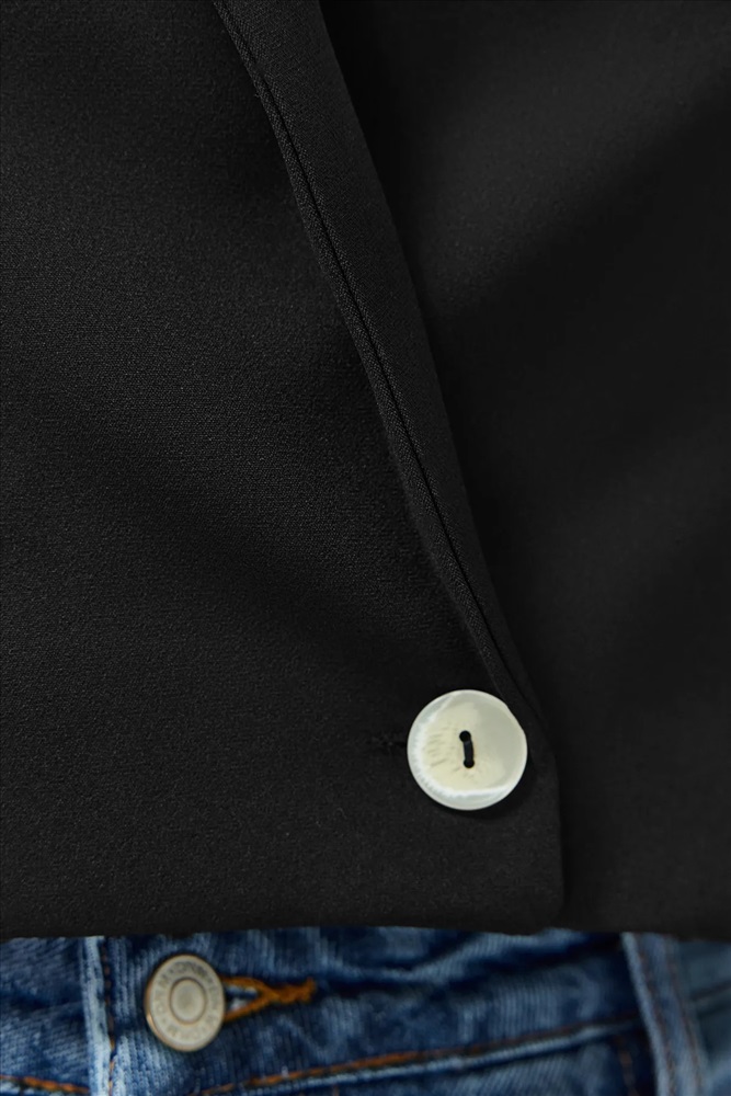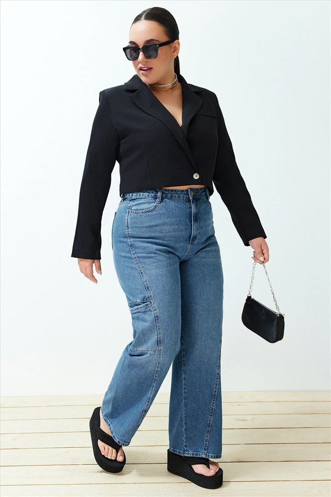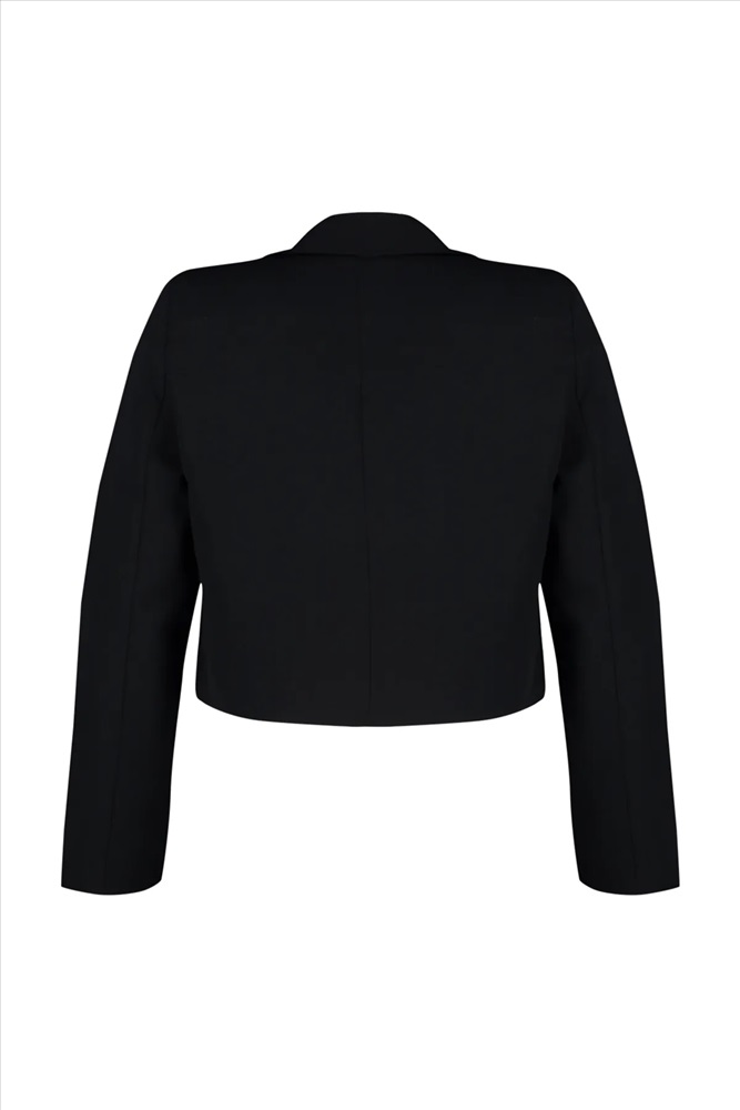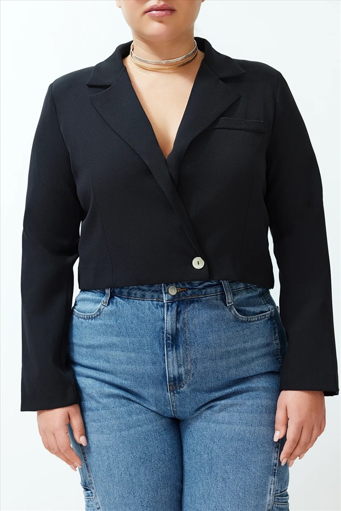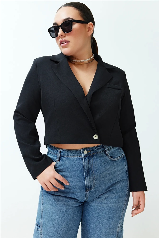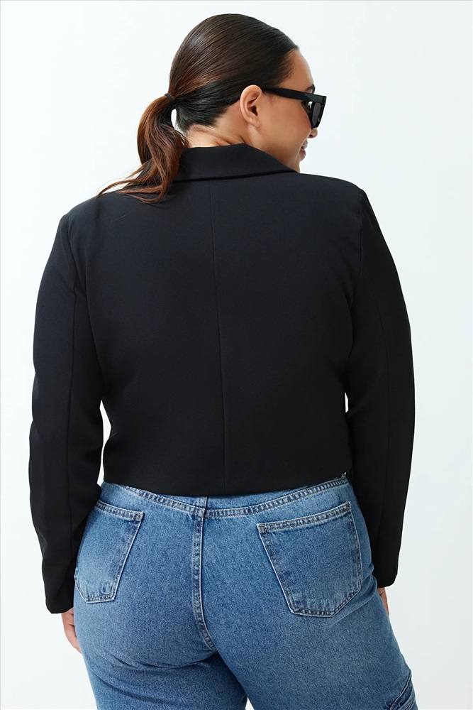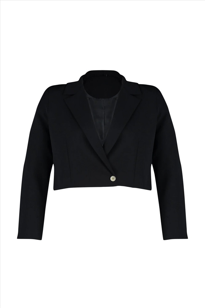 Siyah Crop Astarlı Büyük Beden Blazer Dokuma Ceket TBBSS24AG00003