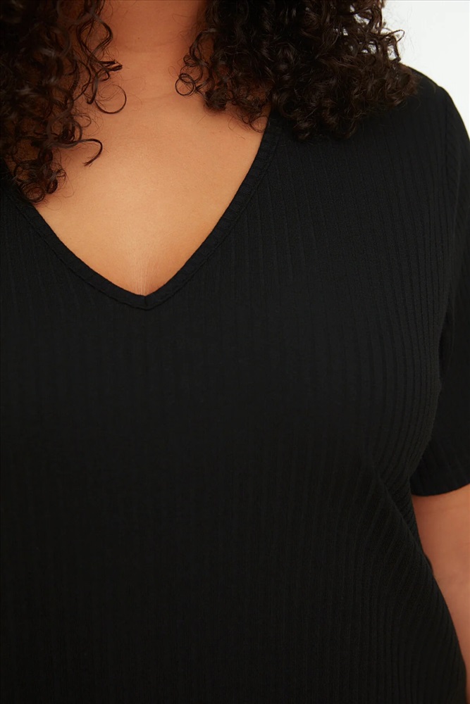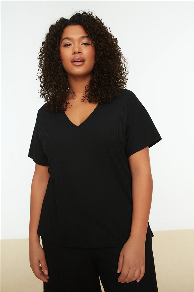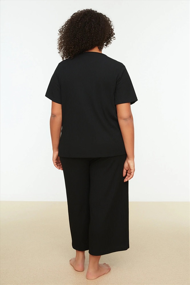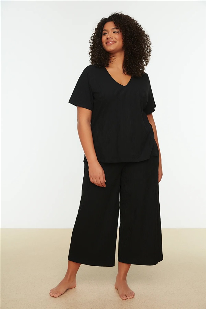 Siyah Fitilli V Yaka Capri Boy Örme Pijama Takımı TBBSS22PT0237