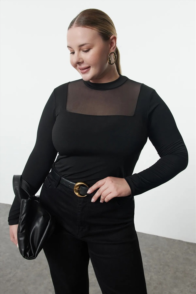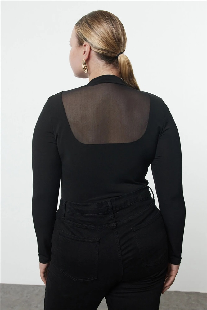 Siyah Fitted/Vücuda Oturan Tül Detaylı Uzun Kollu Dik Yaka Esnek Çıtçıtlı Örme Body TBBAW25CS00003