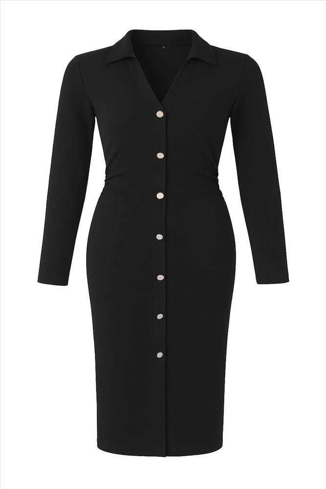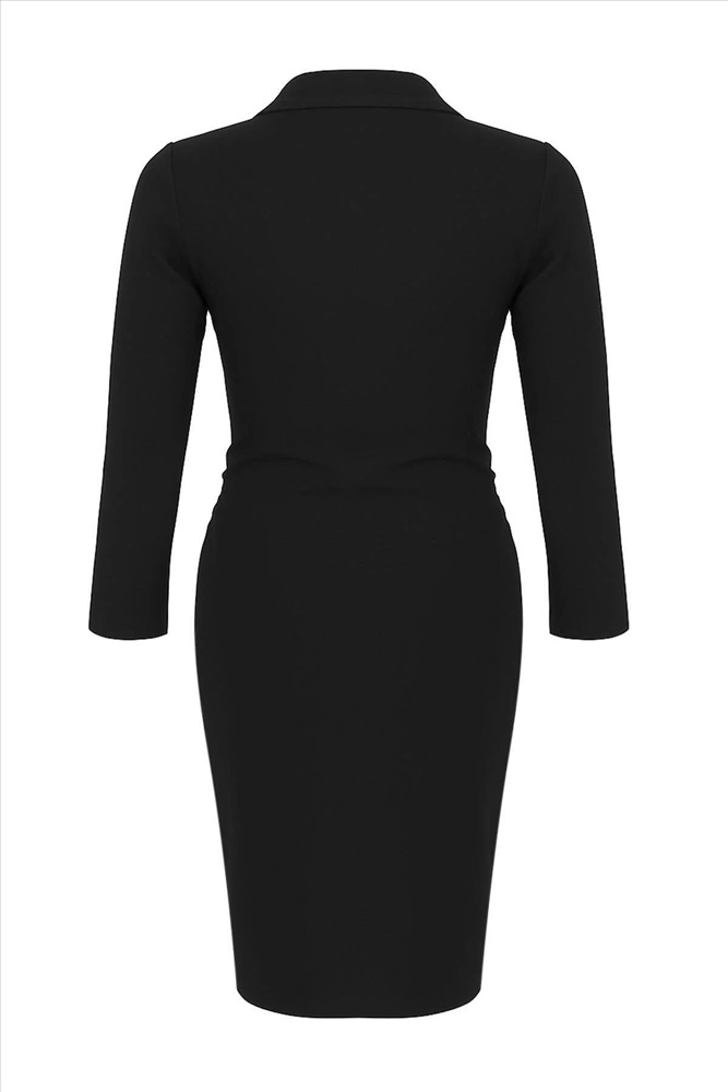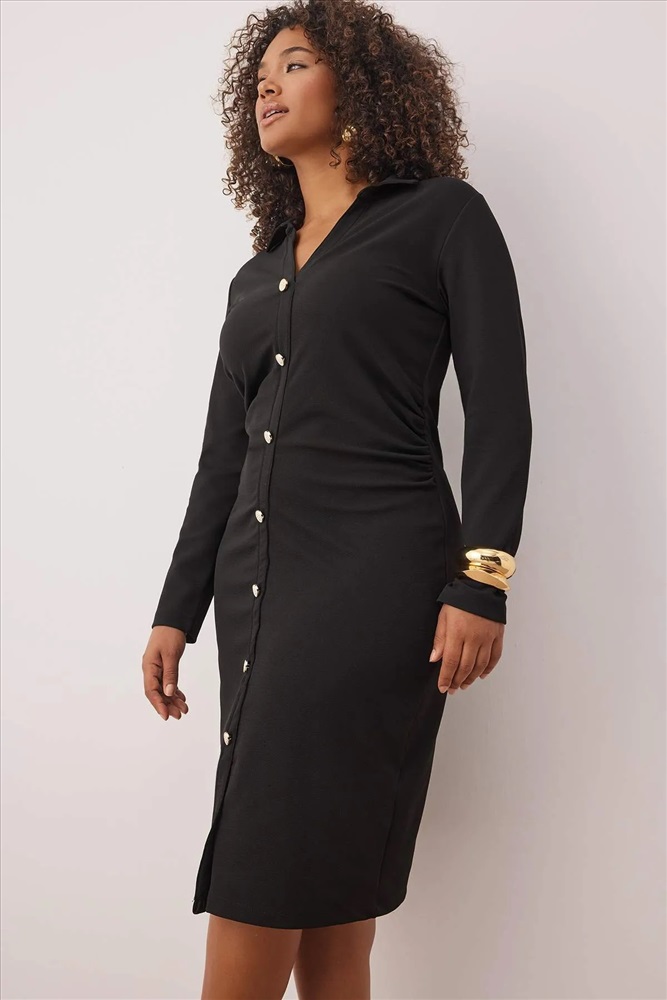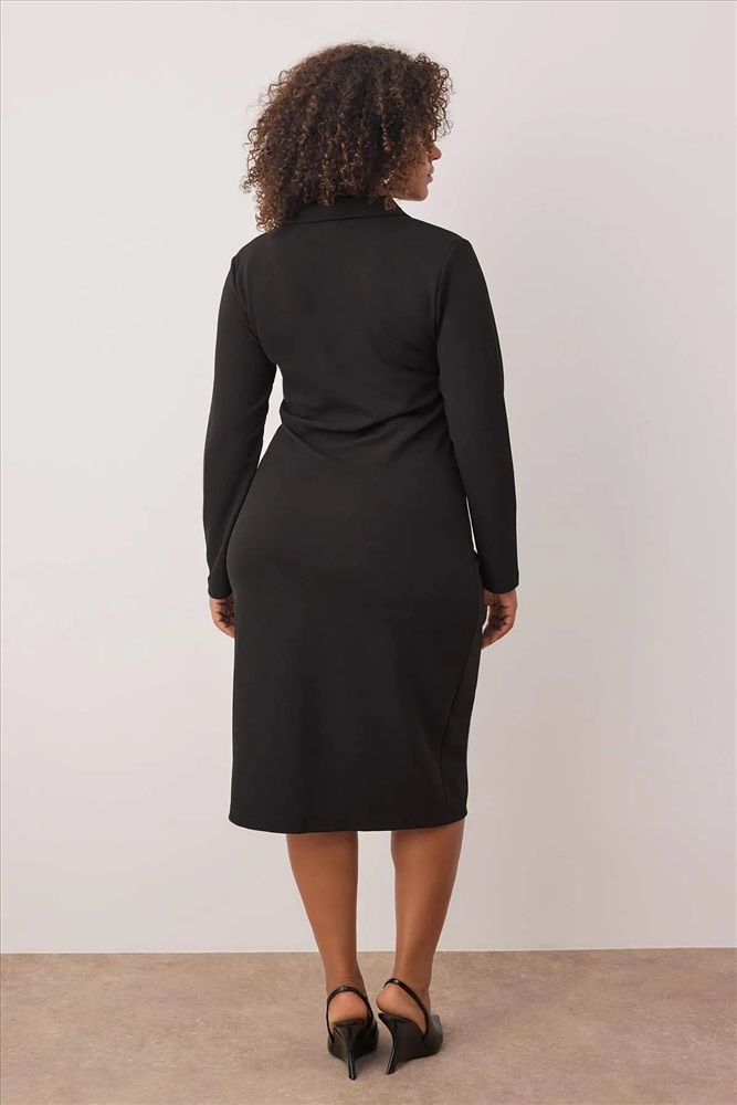 Siyah Gömlek Yaka Büzgü Detaylı Krep Örme Büyük Beden Elbise TBBAW26AH00009