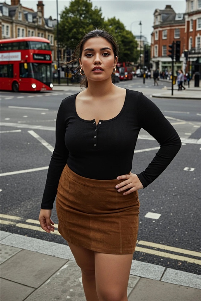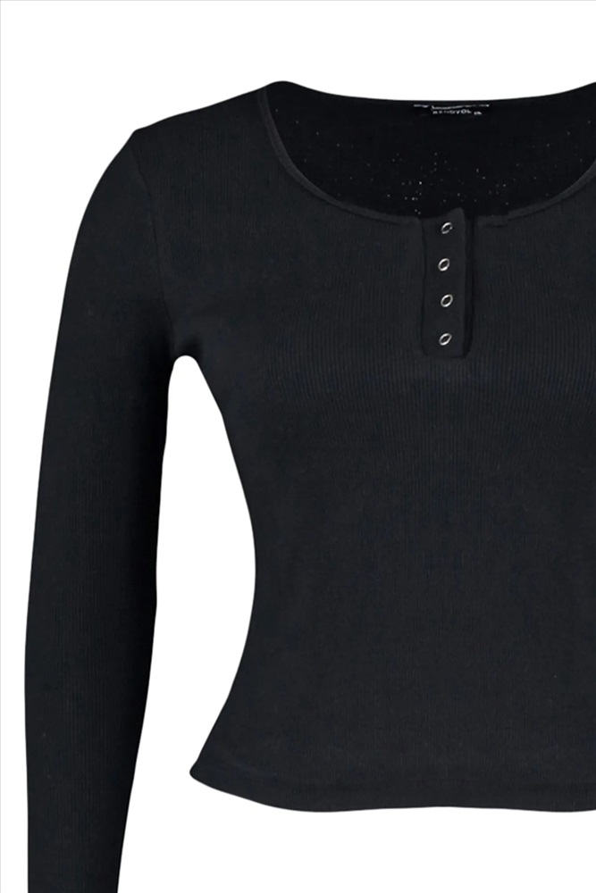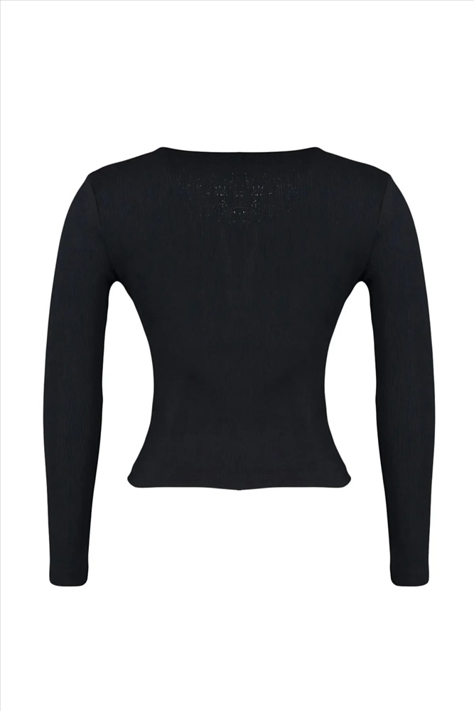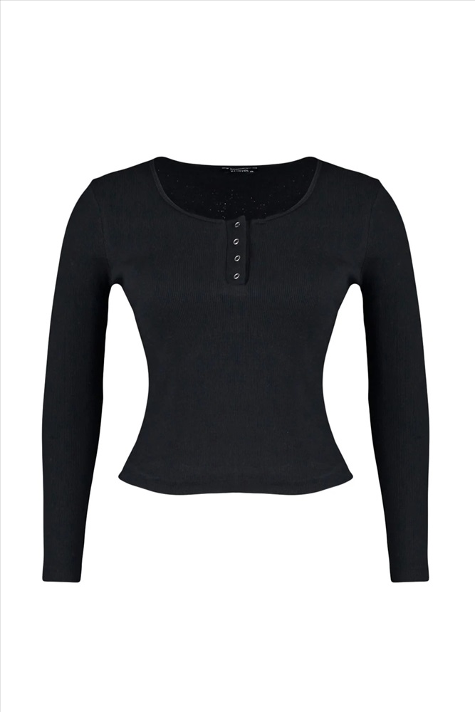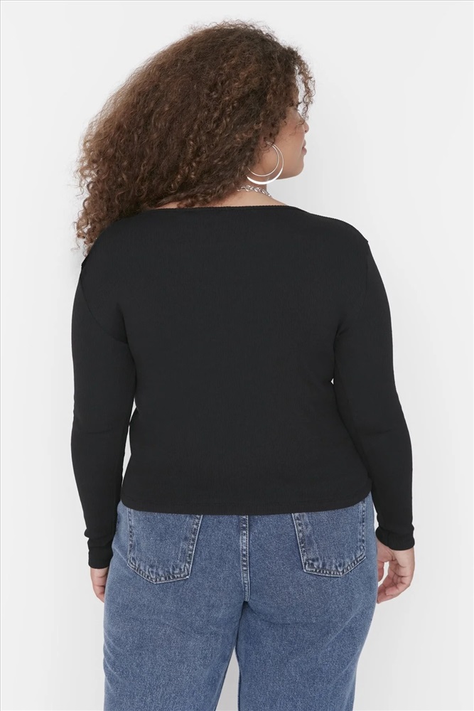 Siyah Havuz Yaka Çıtçıt Detaylı Fitted/Vücuda Oturan Örme Crop Büyük Beden Bluz TBBAW23AF00030