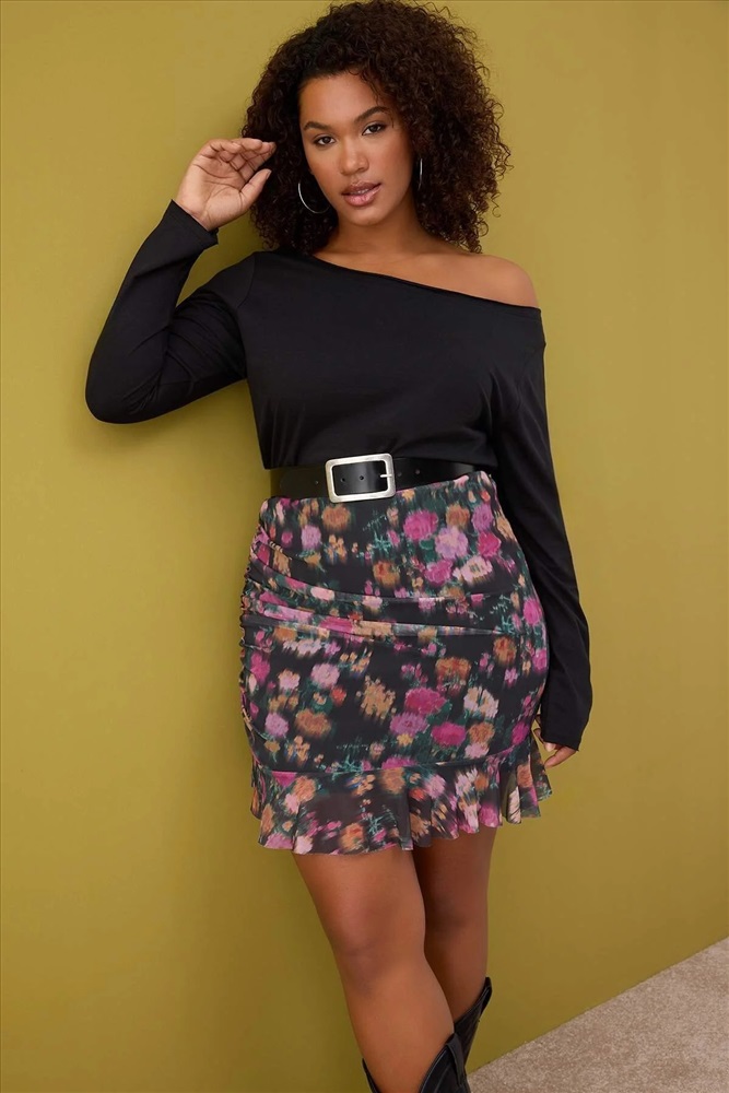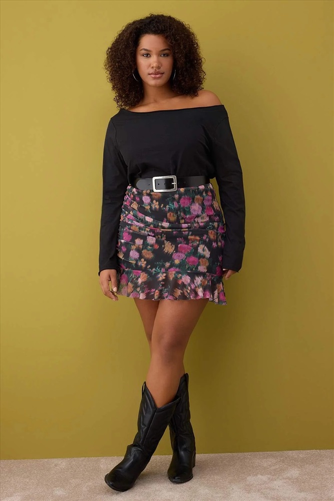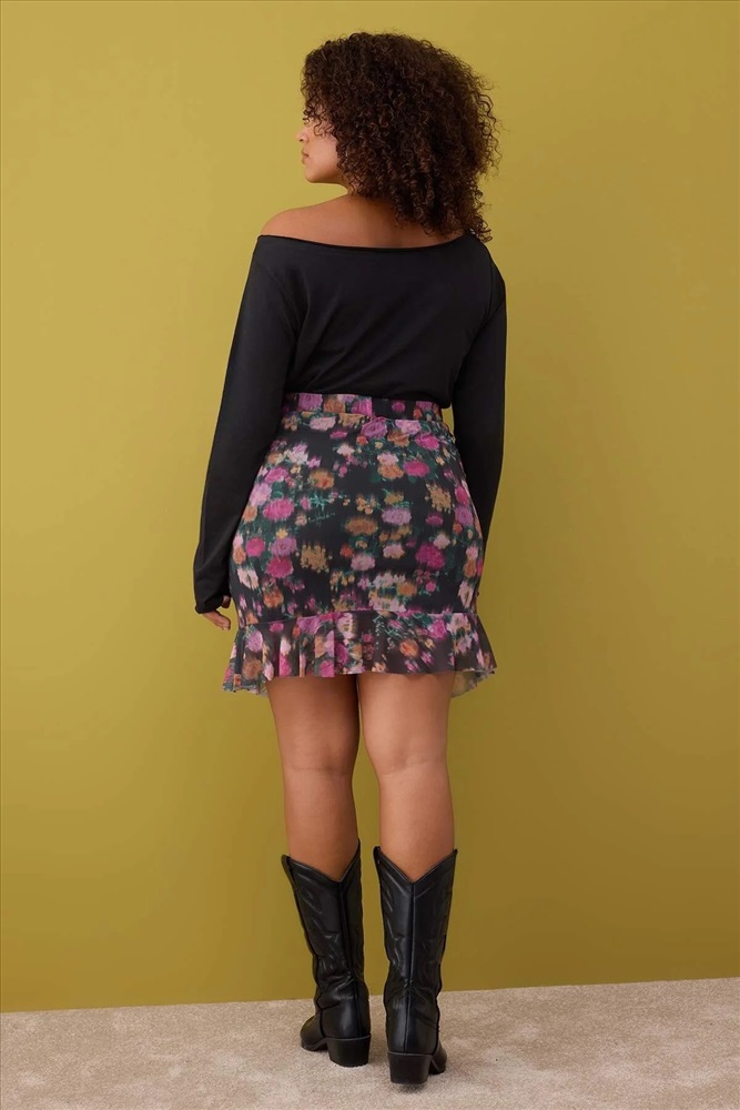 Siyah Çiçekli Mini Örme Büyük Beden Etek TBBAW26AZ00019