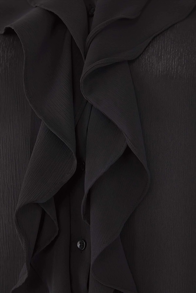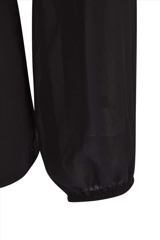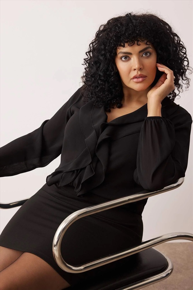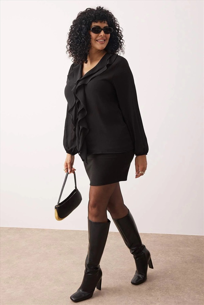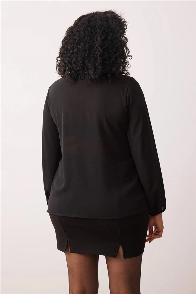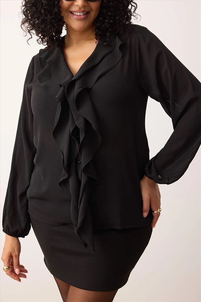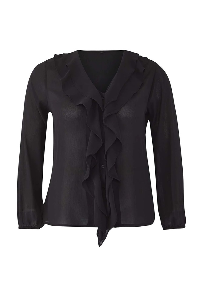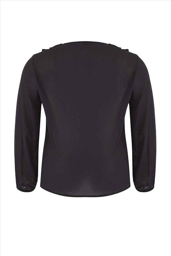 Siyah Şifon V Yakası Fırfırlı Transparan Uzun Kol Dokuma Büyük Beden Bluz TBBAW26AF00003