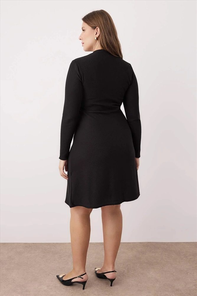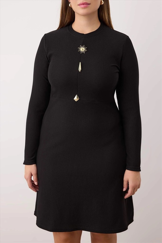 Siyah Kaşkorse Aksesuar Detaylı Örme Büyük Beden Elbise TBBAW26AH00088