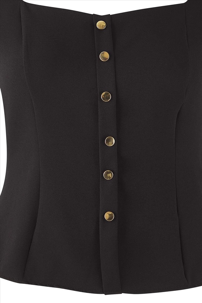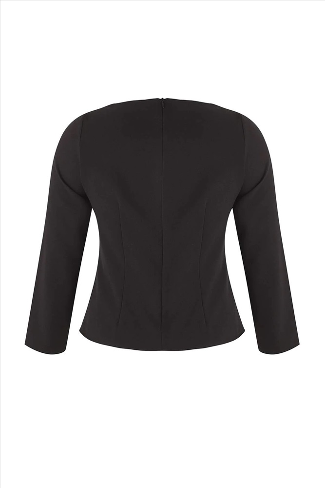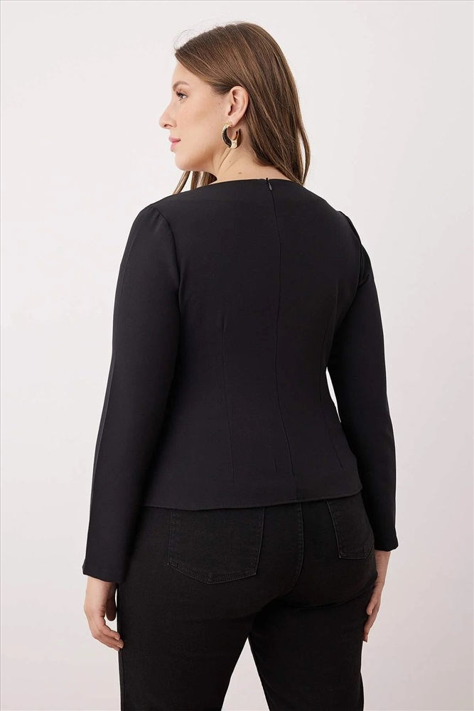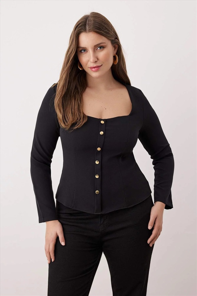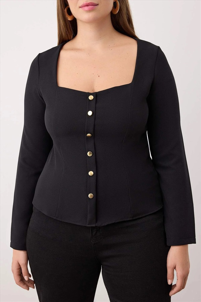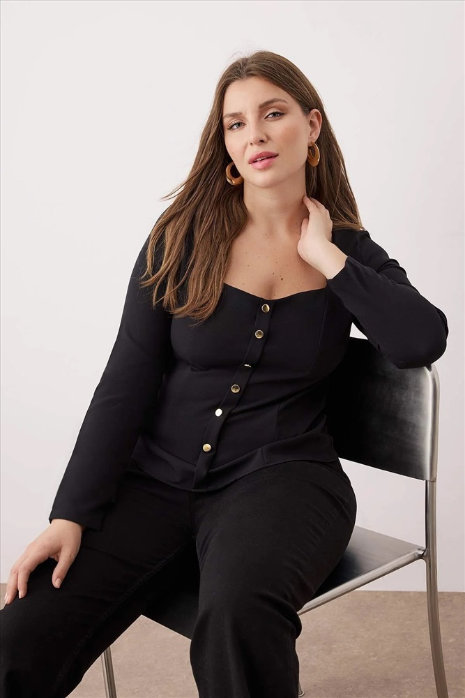 Siyah Kalp Yaka Düğmeli Dokuma Büyük Beden Bluz TBBAW26AF00046