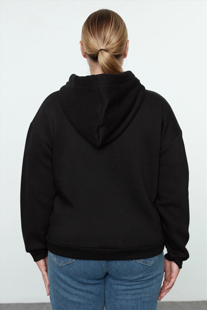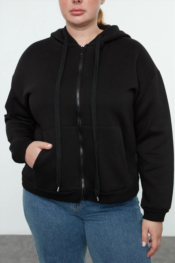 Siyah Kapüşonlu İçi Polarlı Önü Fermuarlı Büyük Beden Örme Sweatshirt