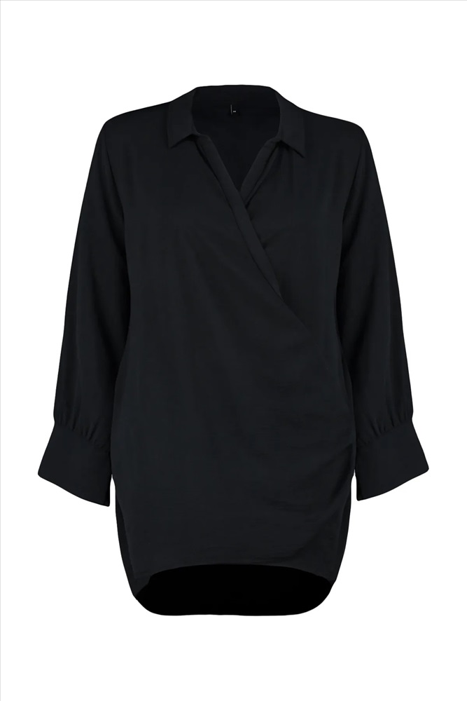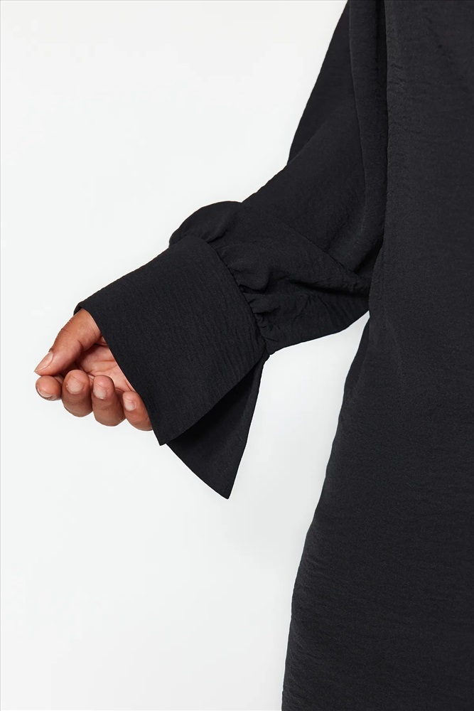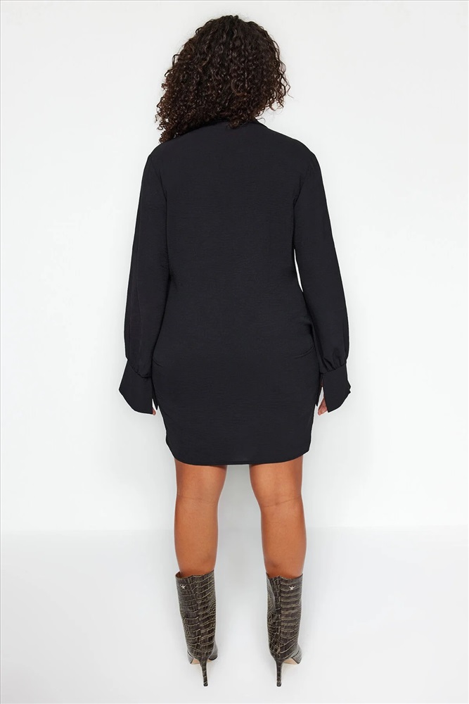 Siyah Kruvaze Mini Uzun Kol Gömlek Yaka Dokuma Elbise TBBAW24AH00102
