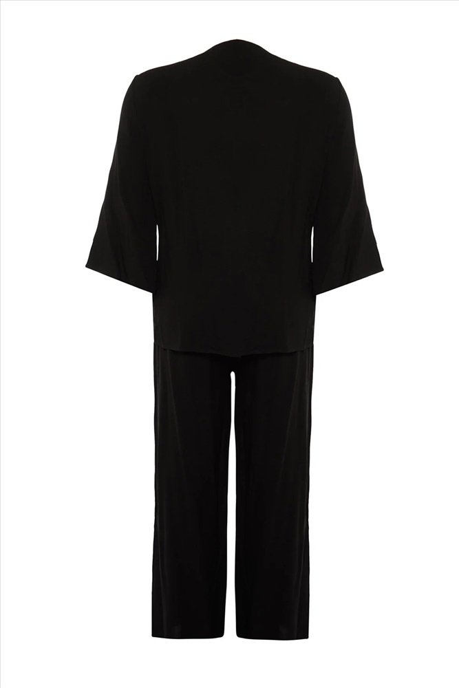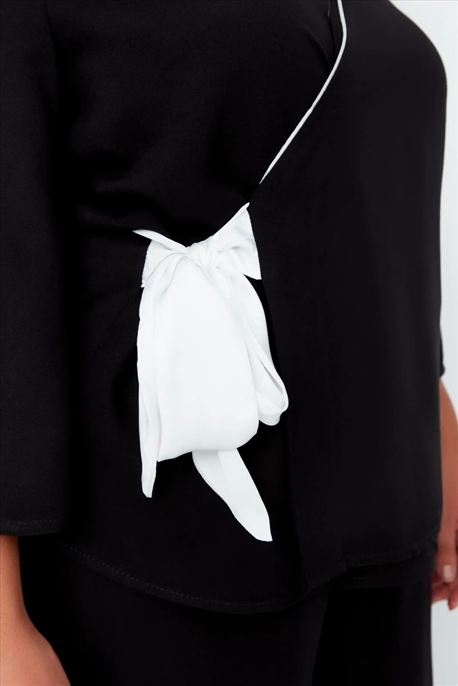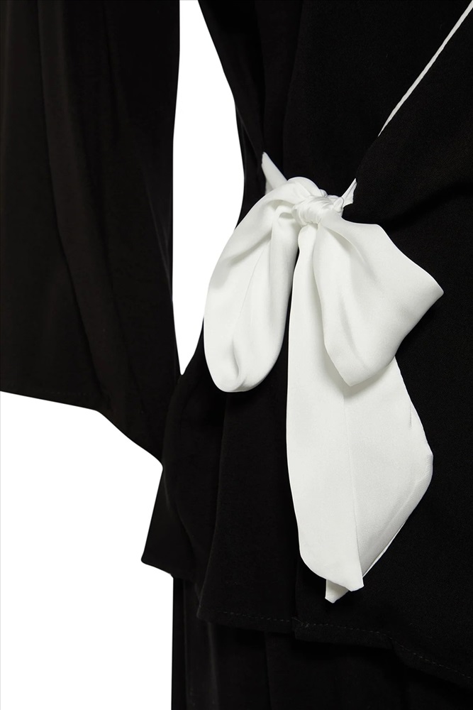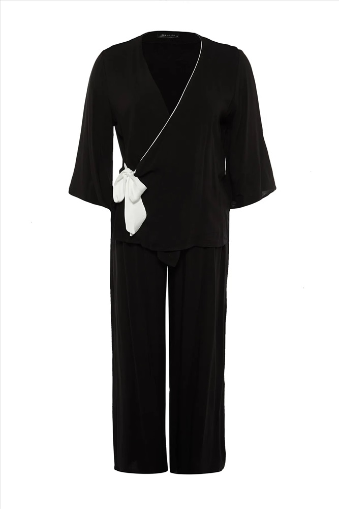 Siyah Kruvaze Yaka Bağlamalı Dokuma Pijama Takımı TBBAW23AI00032