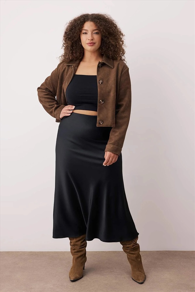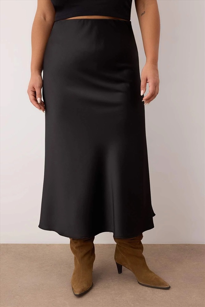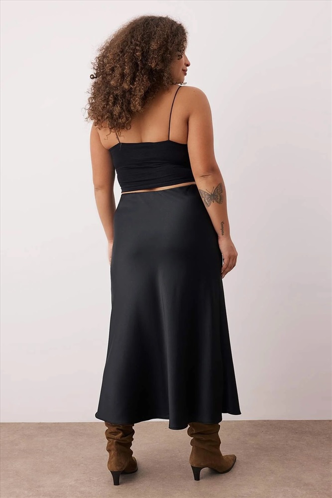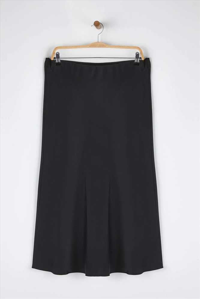 Siyah Midi Boy Saten Dokuma Büyük Beden Etek TBBAW26AZ00008