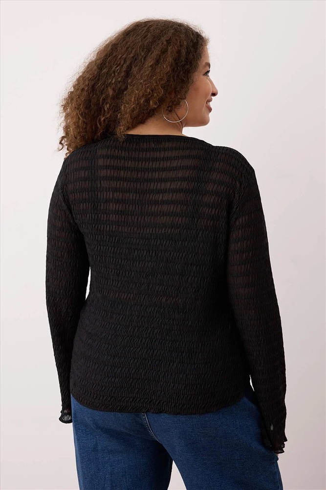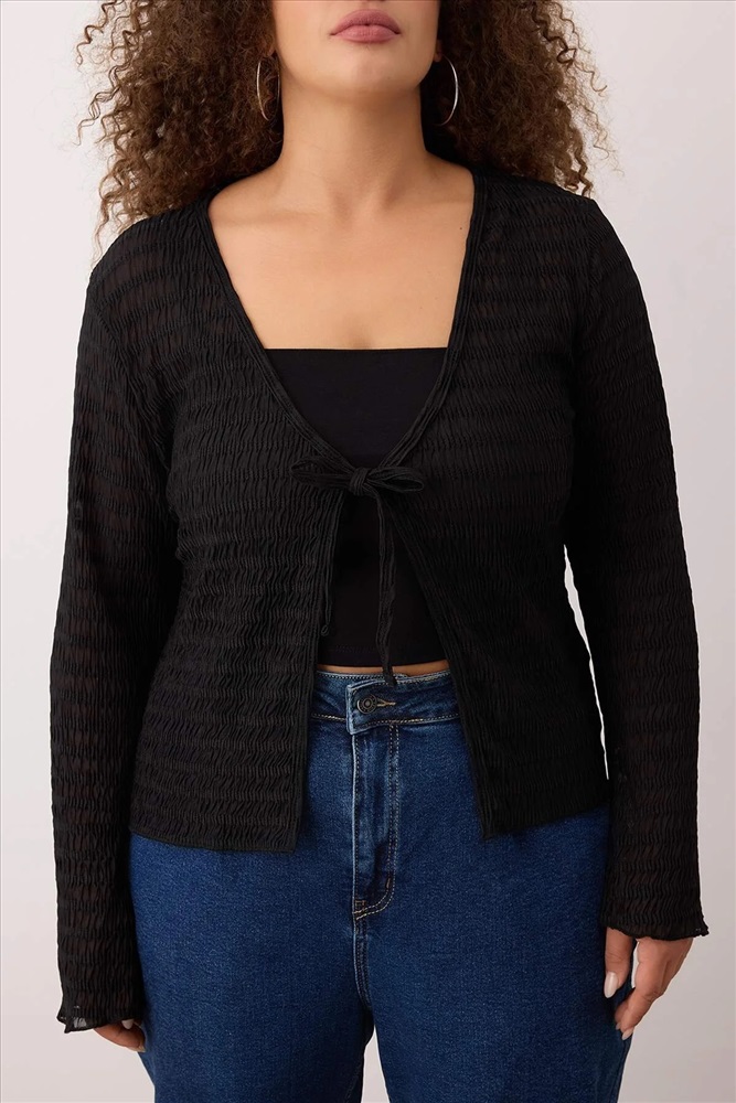 Siyah Premium Bağlama Detaylı Dokulu V Yaka Esnek Örme Büyük Beden Bluz TBBAW26AF00032