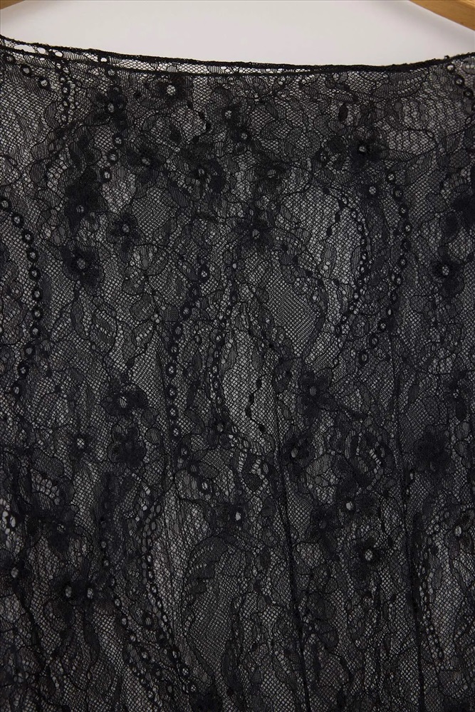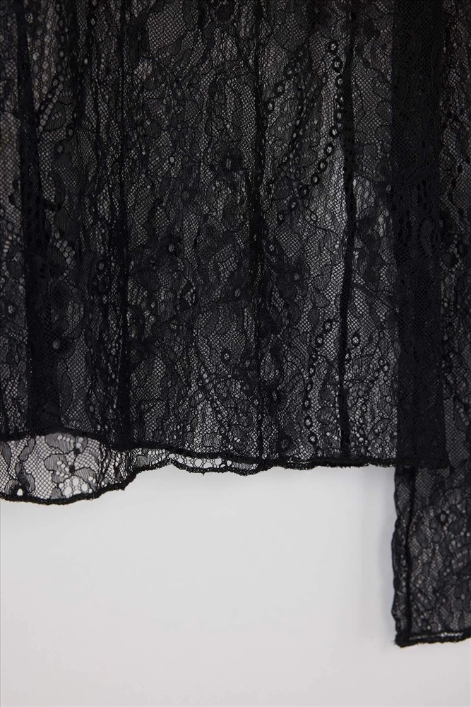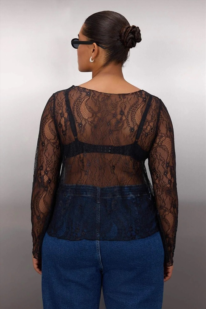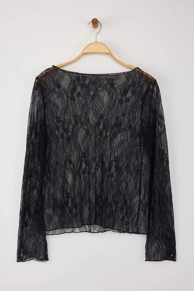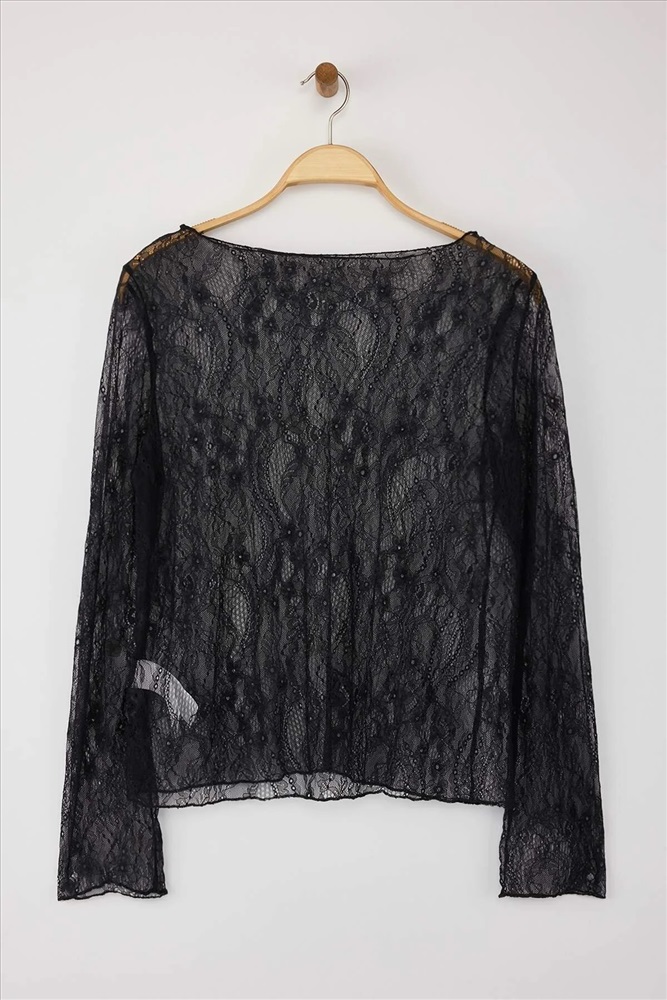 Siyah Regular Fit Kayık Yaka Dantel Esnek Örme Büyük Beden Bluz TBBAW26AF00031