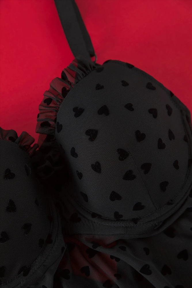 Siyah Sabit Kaplı Ayarlanabilir Askılı Flok Kalp Desenli Büyük Beden Babydoll TBBSS25DH00000
