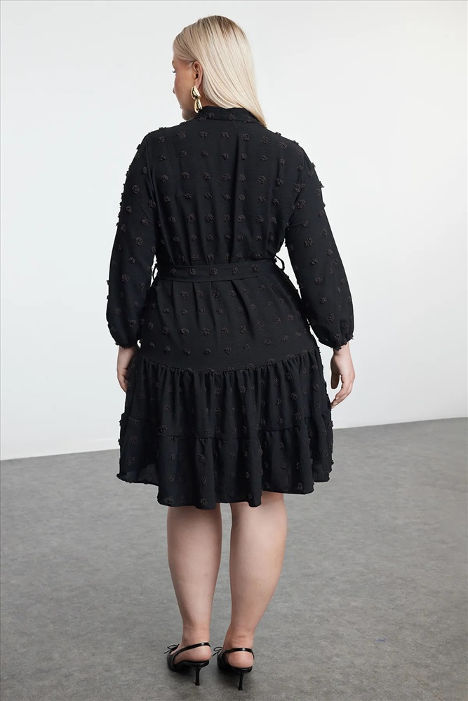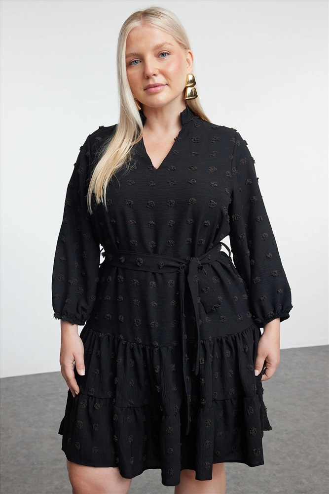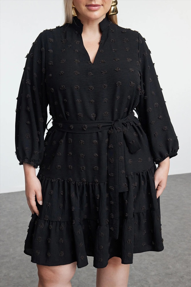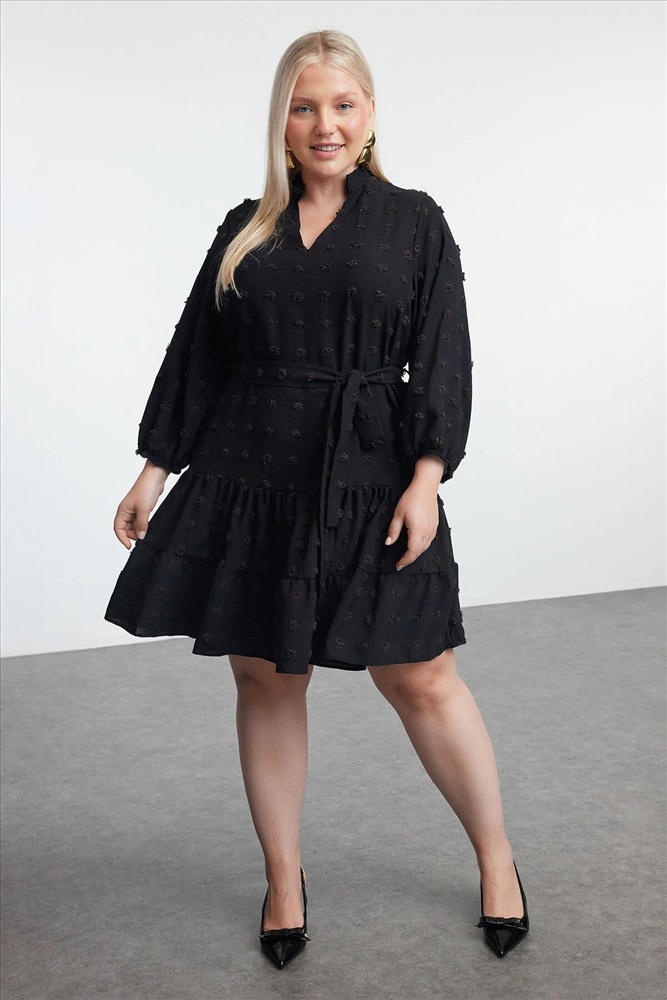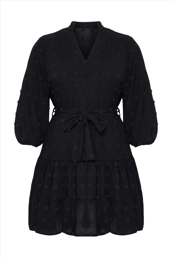 Siyah V Yaka Balon Kol Kuşaklı Ponponlu Dokuma Mini Büyük Beden Elbise TBBAW25AH00053