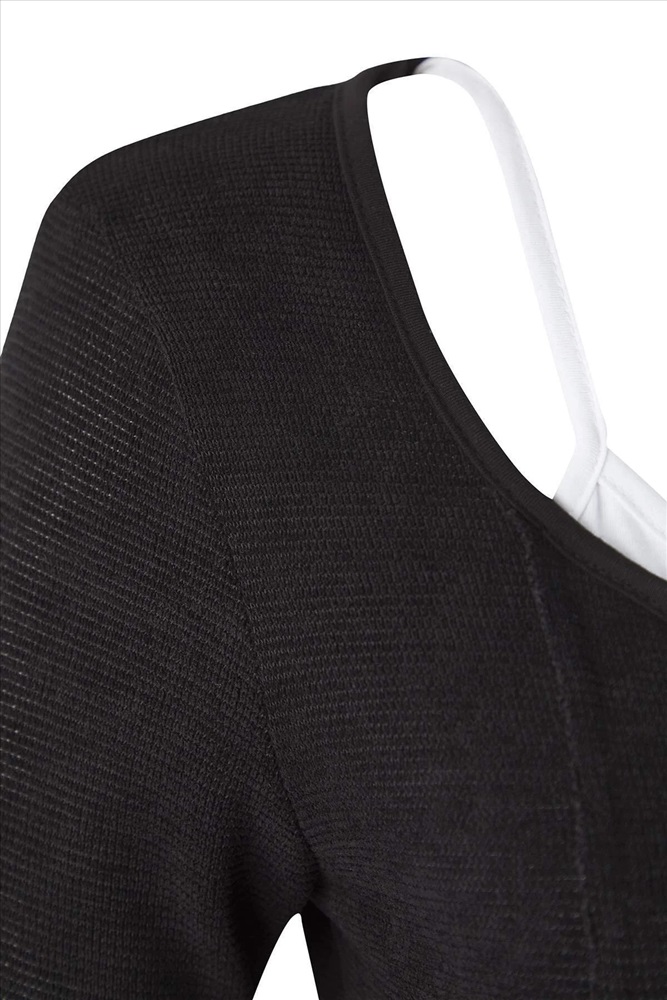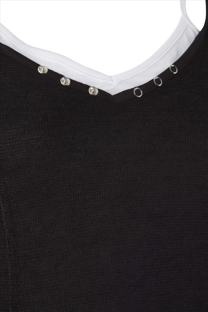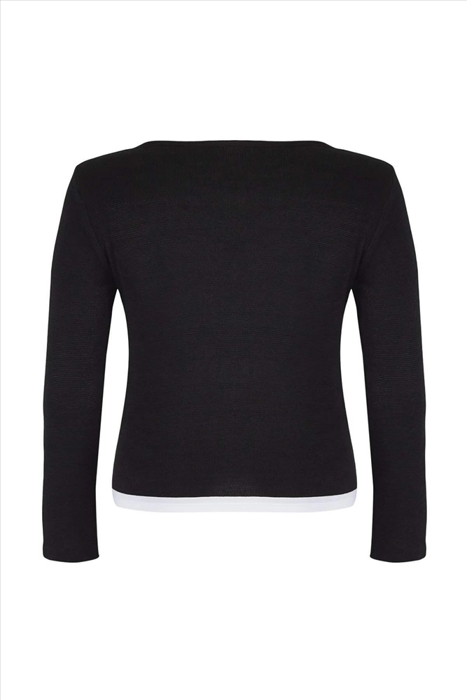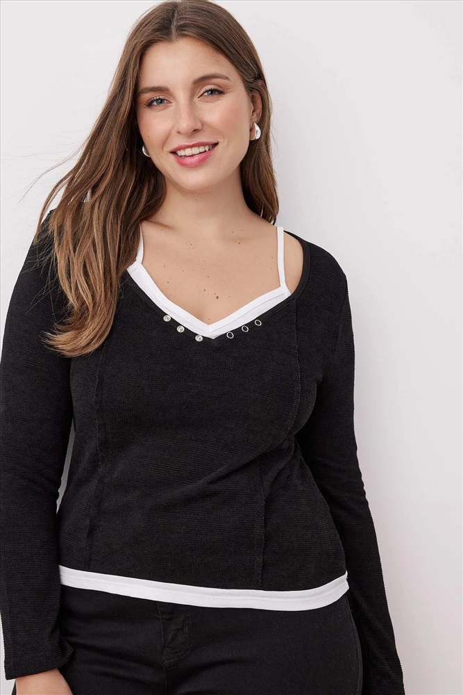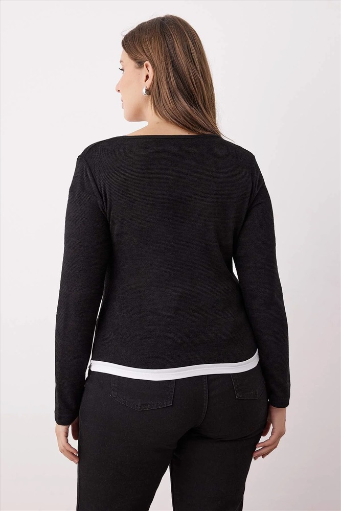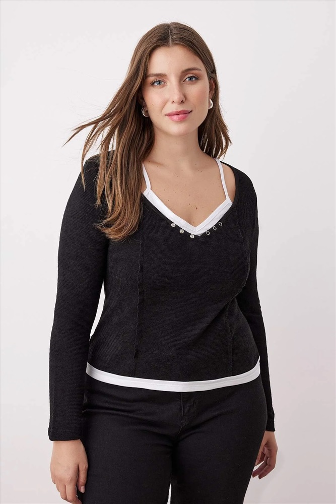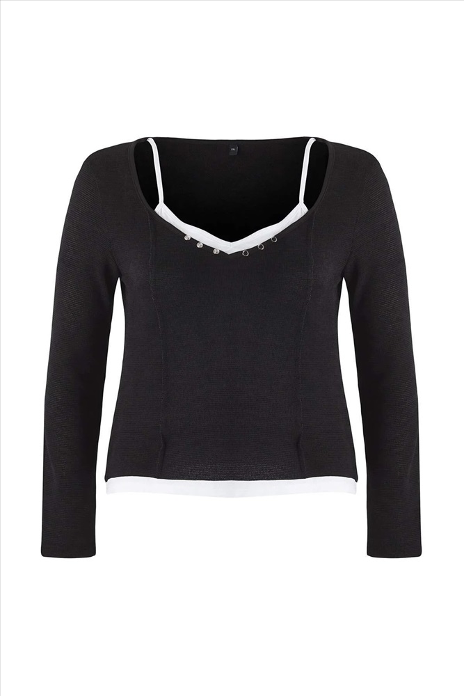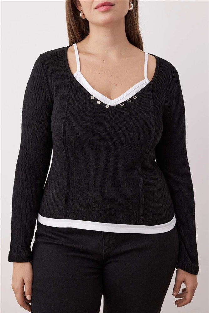 Siyah V Yaka Çıtçıt Detaylı Örme Büyük Beden Bluz TBBAW26AF00043