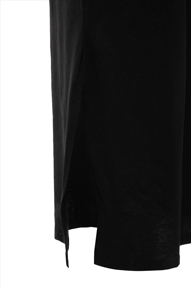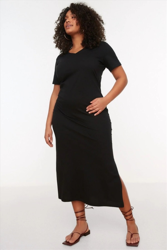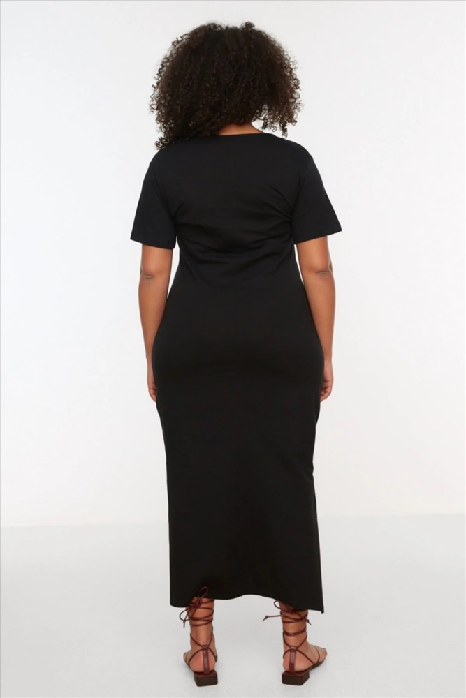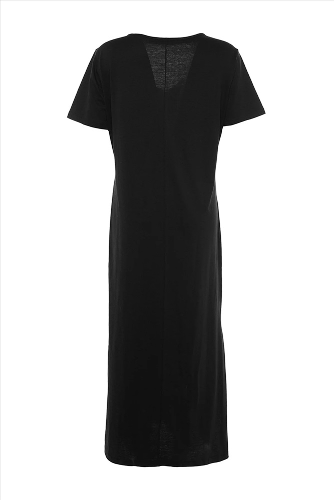 Siyah V Yaka Yırtmaçlı Maxi/Uzun %100 Pamuk Örme Elbise TBBSS22AH0163