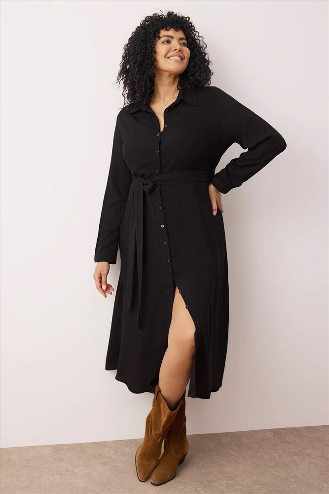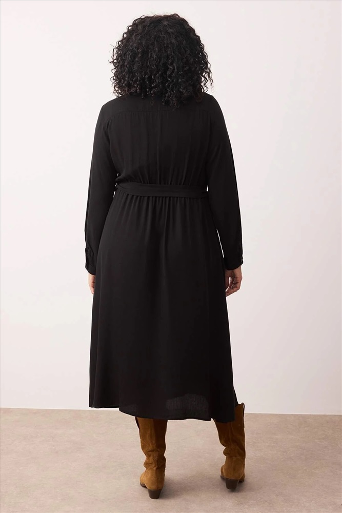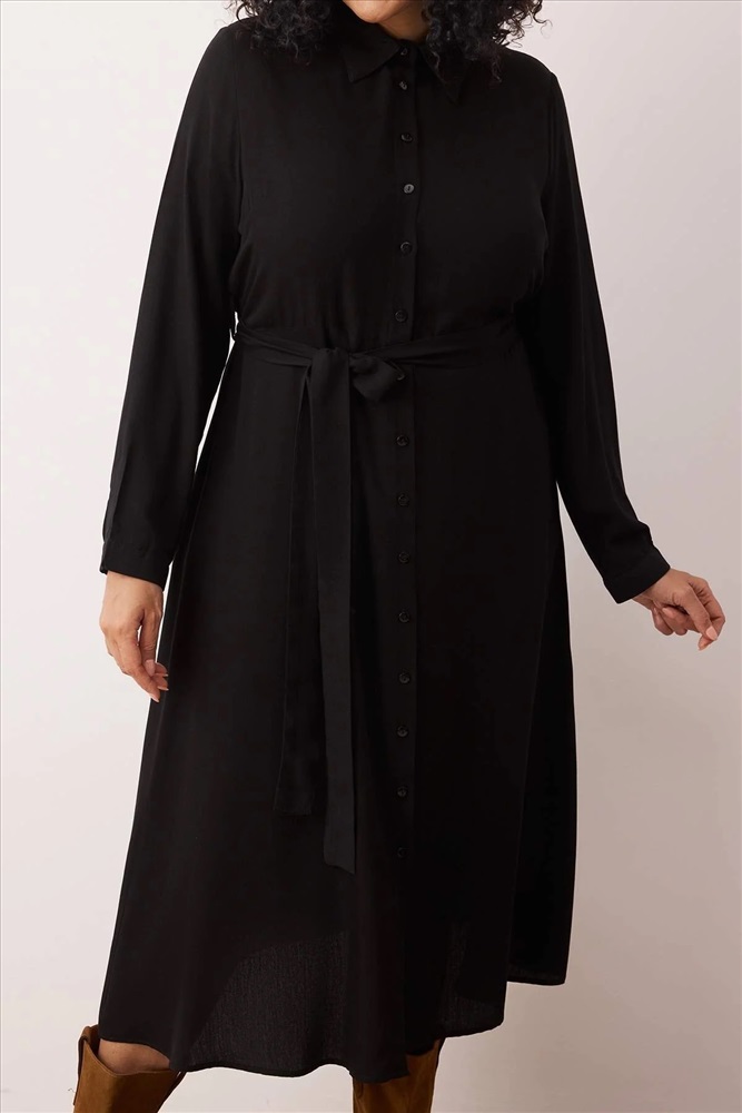 Siyah Viskon Kuşaklı Midi Dokuma Büyük Beden Gömlek Elbise TBBAW26AH00039