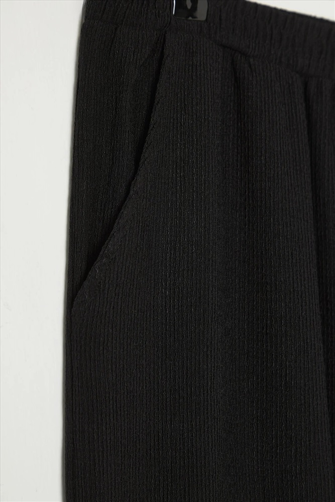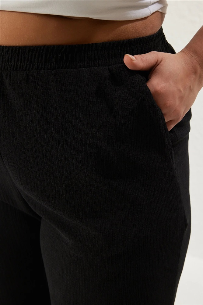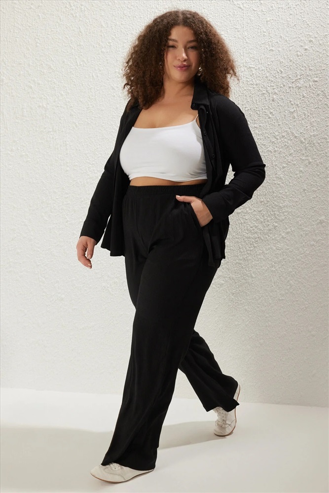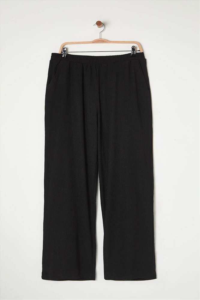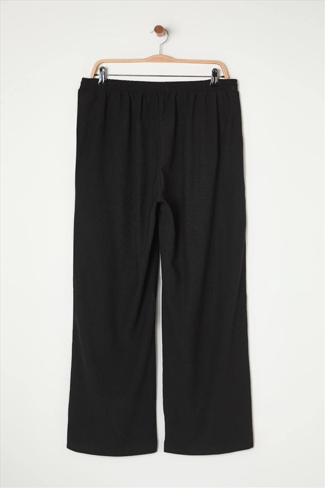 Siyah Yüksek Bel Geniş Paça Dokulu Bürümcük Kumaş Büyük Beden Pantolon TBBSS25AR00002