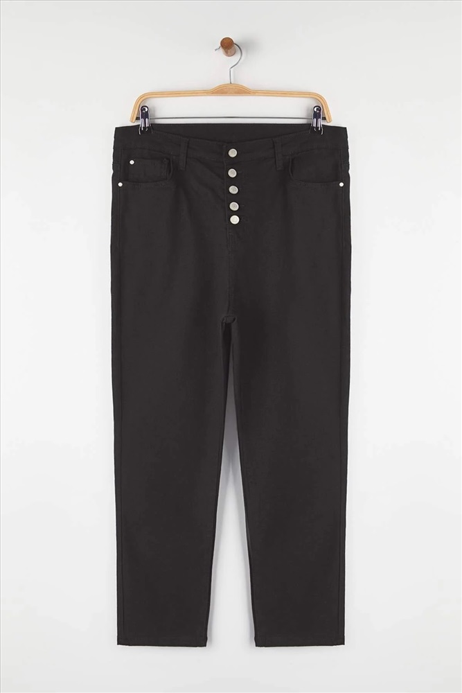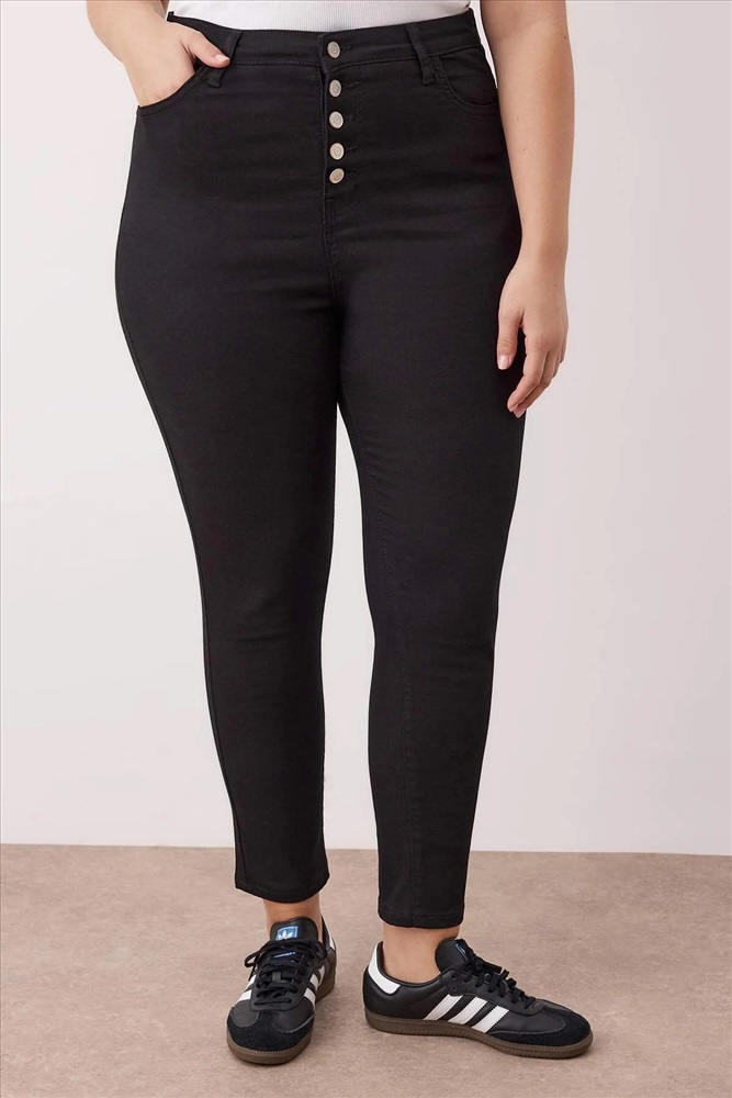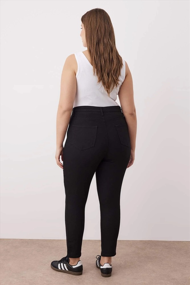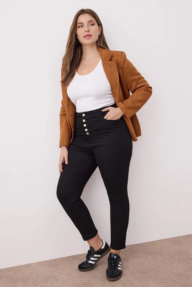 Siyah Yüksek Bel Önü Düğmeli Solmayan Siyah Büyük Beden Skinny Jeans TBBAW26CJ00042
