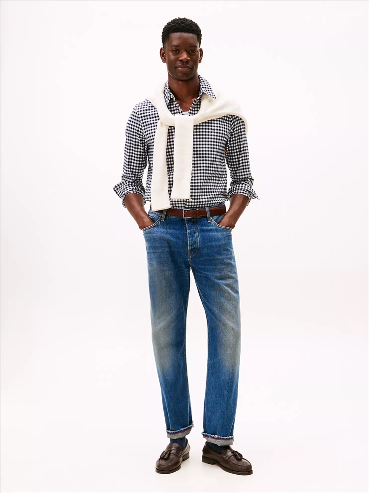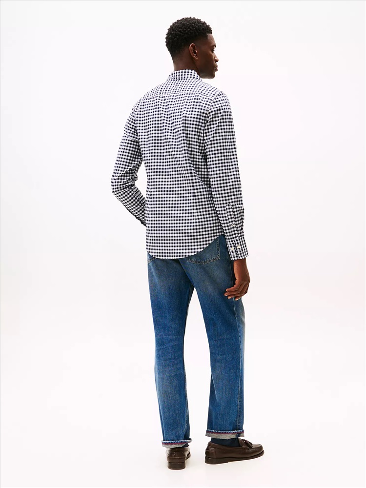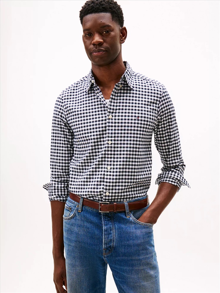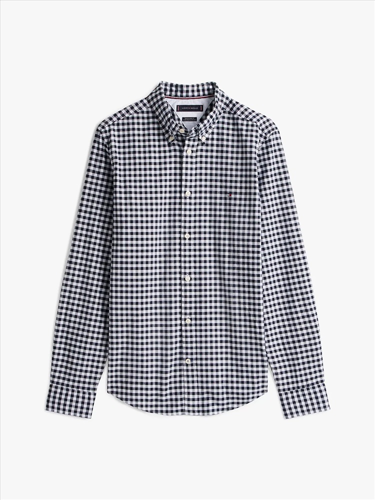 Tommy Hilfiger men's shirt. Embrace classic, easy-going style with this slim-fit Oxford shirt, made from soft cotton with added stretch and finished in a gingham print.