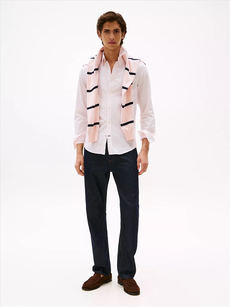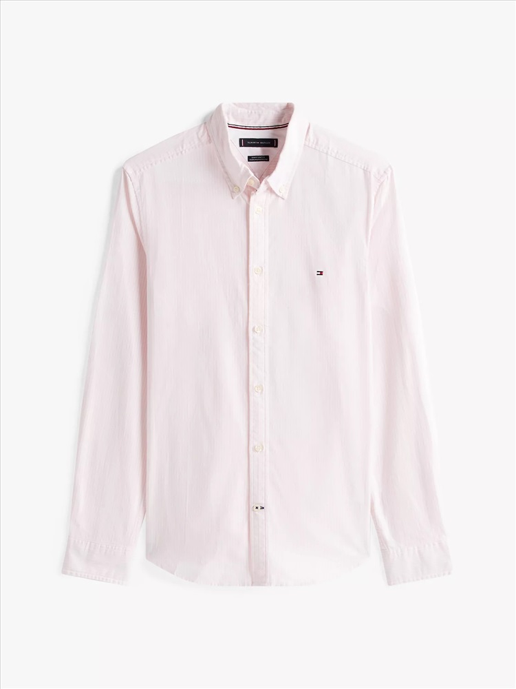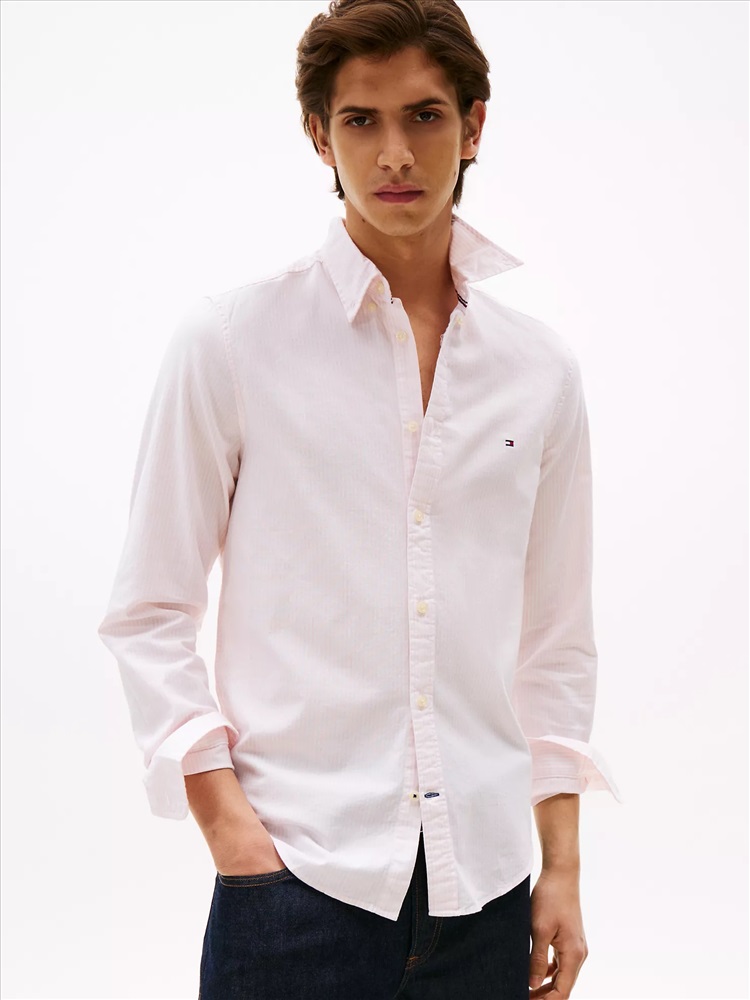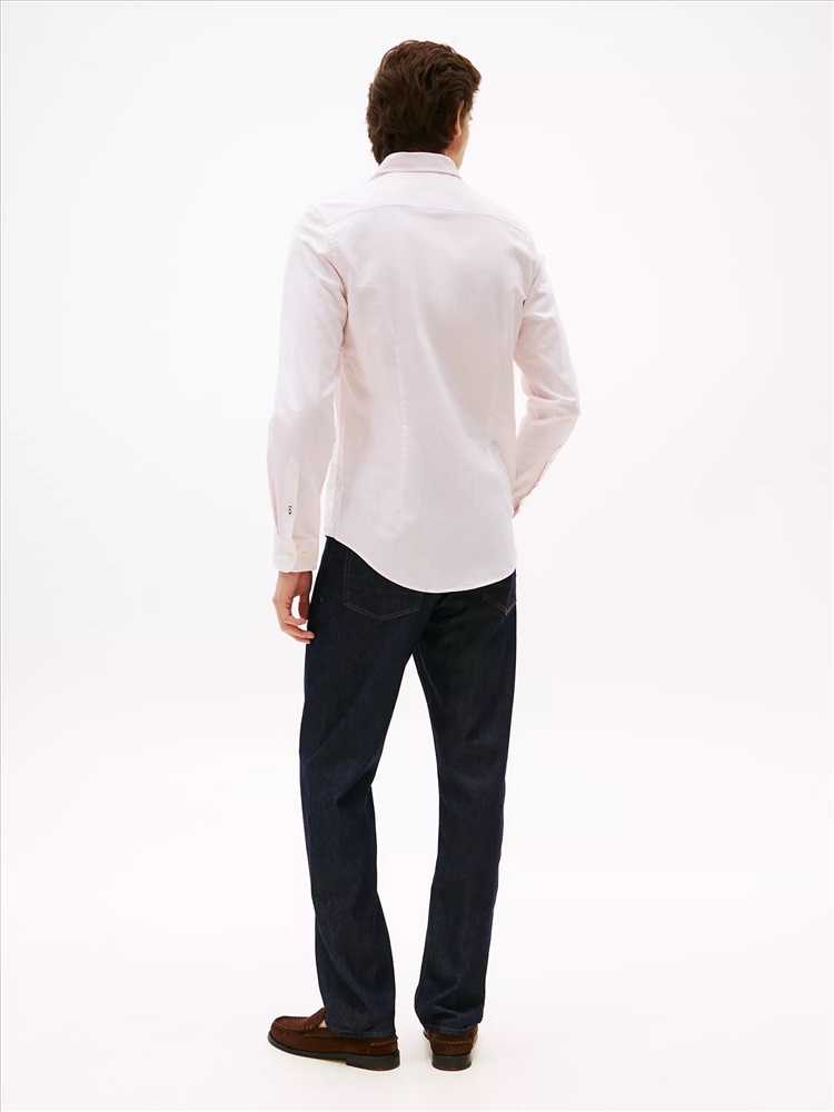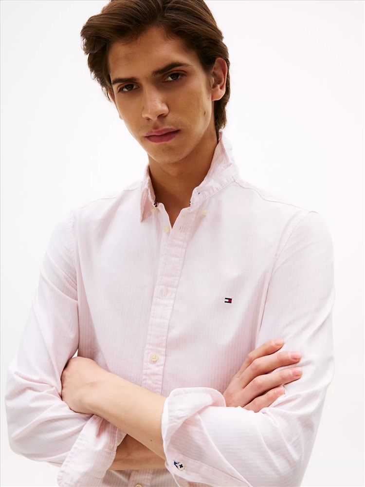Tommy Hilfiger men's shirt. Embrace classic, easy-going style with this slim-fit Oxford shirt, made from soft cotton with added stretch and distinguished by a stripe print.