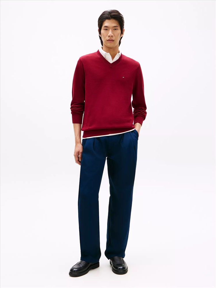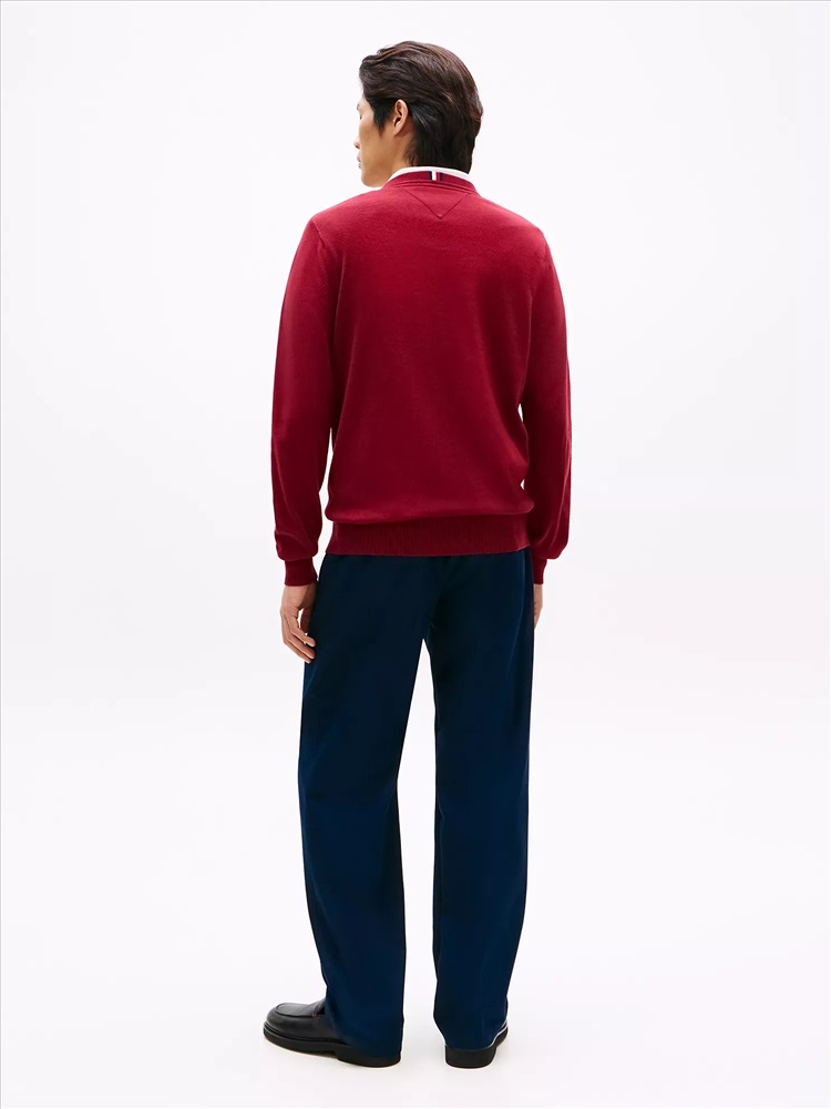 Tommy Hilfiger men's sweater. Made from soft cotton in a smooth jersey stitch, this V-neck is the perfect lightweight layer. It's designed with rib-knit trim and touches of subtle branding for a versatile, timeless look.