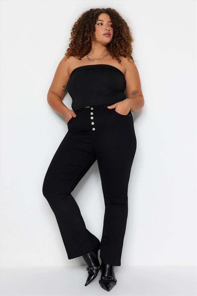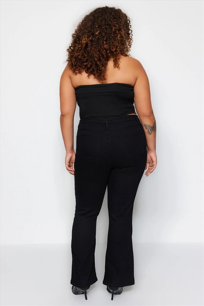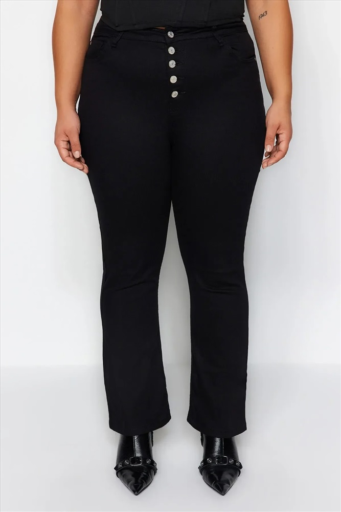 Solmayan Siyah Önden Düğmeli İspanyol Paça Yüksek Bel Jeans TBBAW24CJ00001