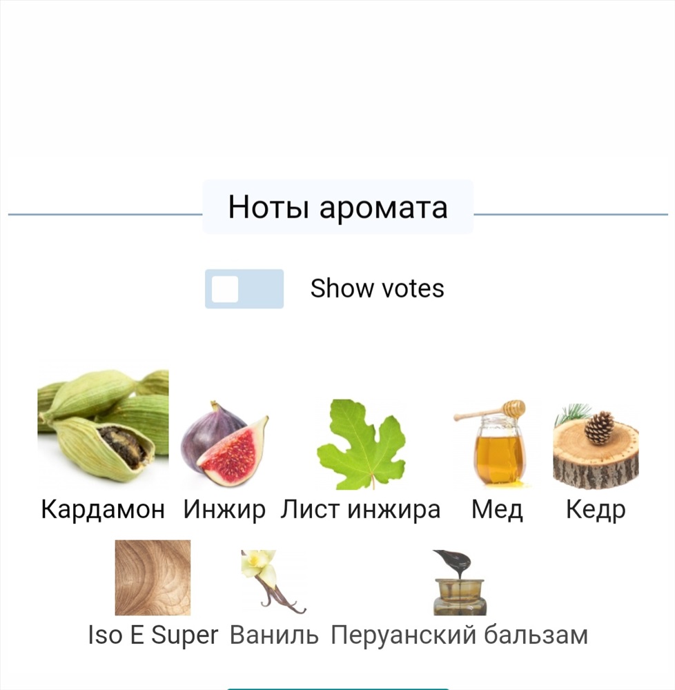 Композиция аромата включает в свой состав следующие ноты : Спелый инжир, фиговый лист, кардамон, карамелизированный мед, ваниль, перуанский бальзам, Кедр, Iso E Super.
