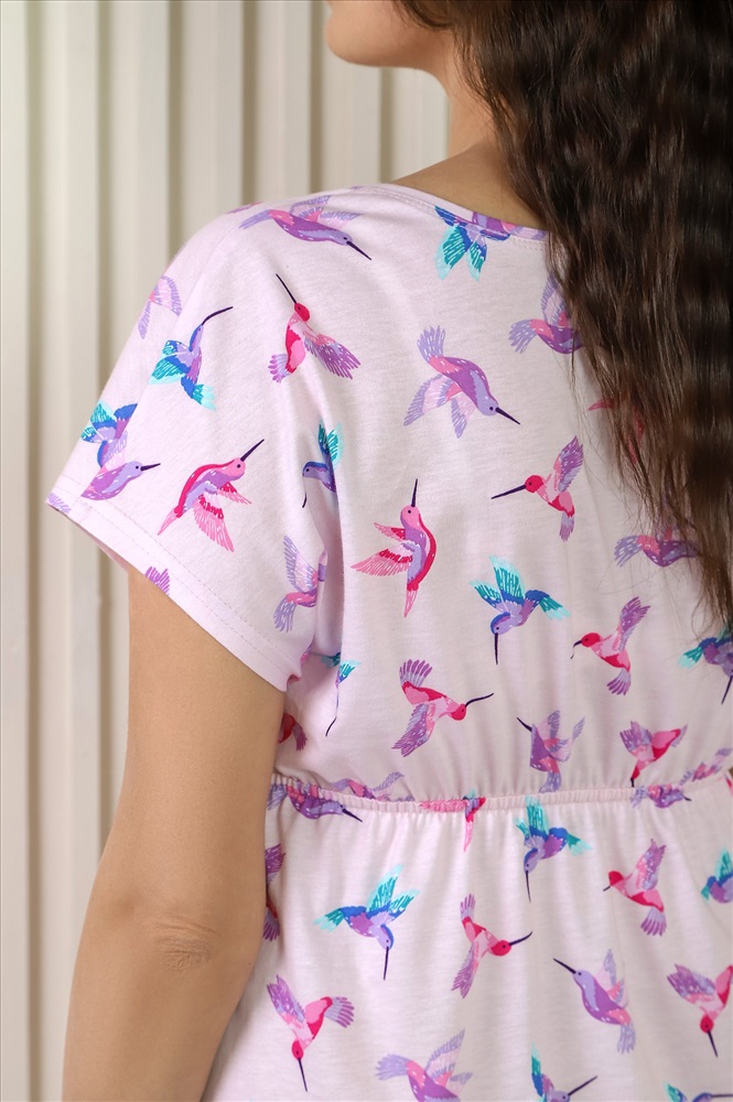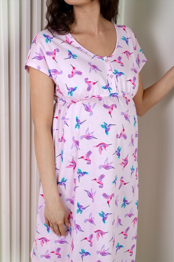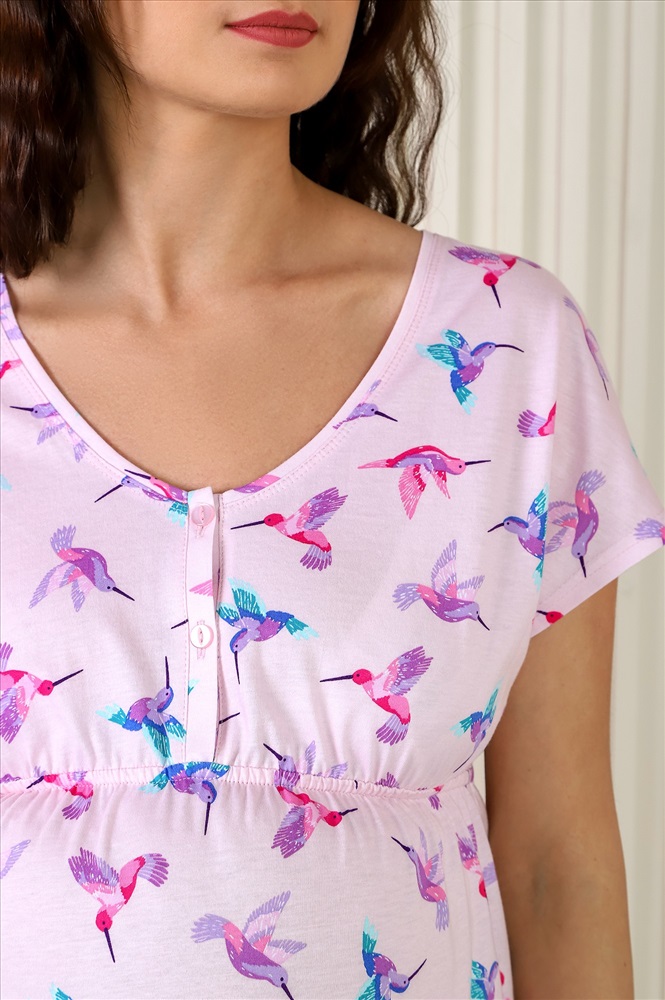 Сорочка из хлопкового трикотажного полотна с набивным рисунком эксклюзивного дизайна, для беременных и кормящих женщин. Модель с цельнокроеными короткими рукавами, с функциональной застежкой на пуговицы в верхней части переда, со сборкой на резинку по завышенной линии талии. Хорошим дополнением к модели станет халат этой же серии "Колибри".