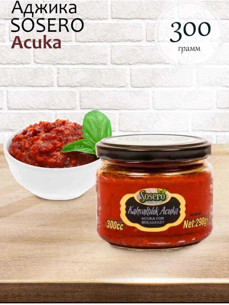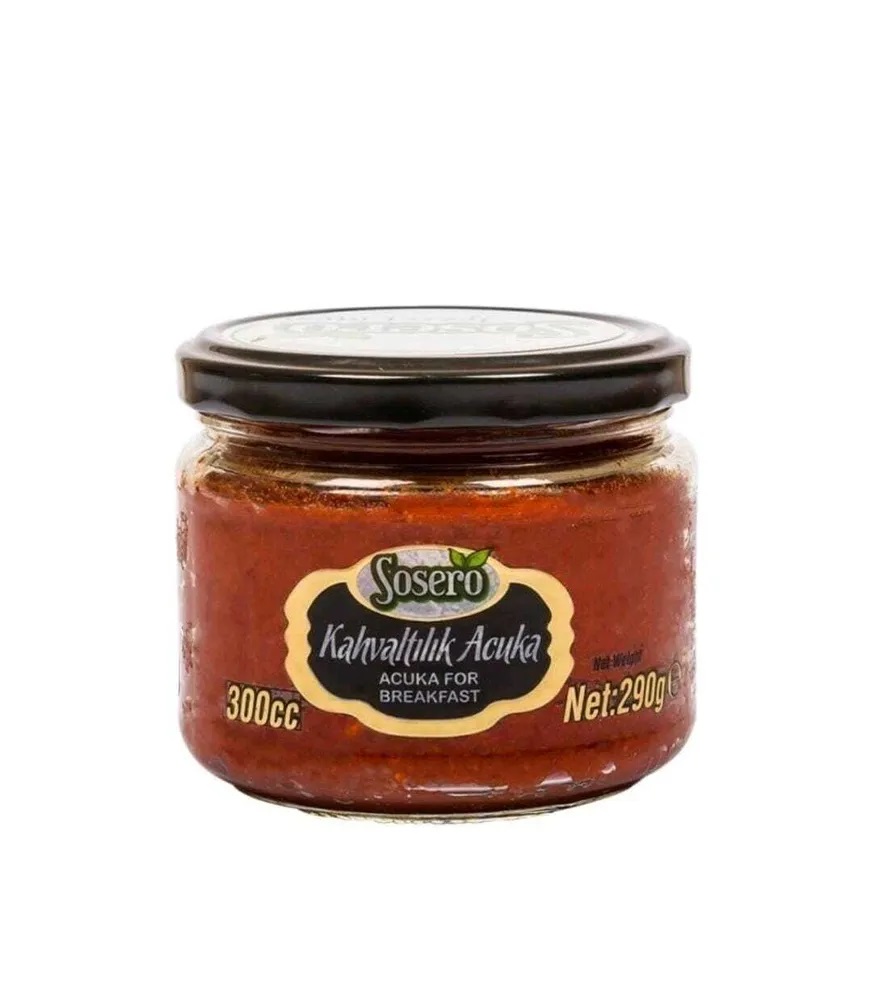 Sosero Acuka for Breakfast - это уникальный соус для завтрака, приготовленный из пасты из сладкого и острого перца, томатной пасты, арахиса, грецких орехов, фундука, растительного масла и смеси специй. Соус отличается своим вкусом и цветом, что делает е