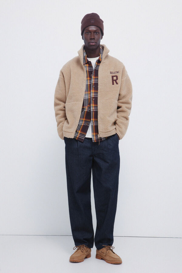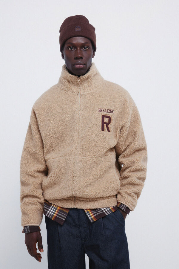 Sudadera de borreguito abierta con cremmalera. Cuello camionero, bordado delantero y espalda.