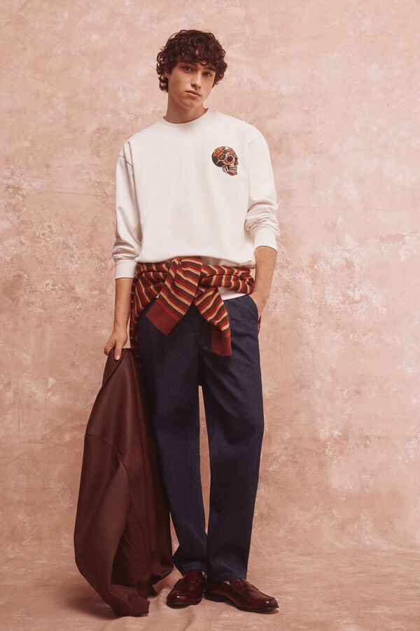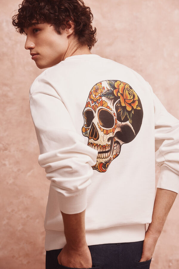 Sudadera algodón loose fit. Cuello redondo y estampado en delantero y espalda de calavera Tattoo.