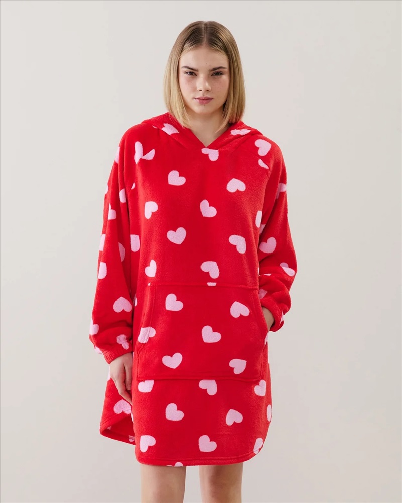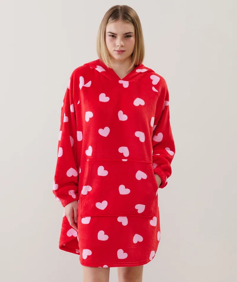 Enamorate de MULTILOVIZ PLAID, ¡nuestra sudadera manta especial para San Valentin! Su estampado de corazones rosas sobre fondo rojo aporta un toque romántico y divertido. Con capucha y bolsillo canguro,ofrece un look ultra comodo. Confeccionada en suave y cálido forro polar, ¡es perfecta para una noche relajada con amigas! ?