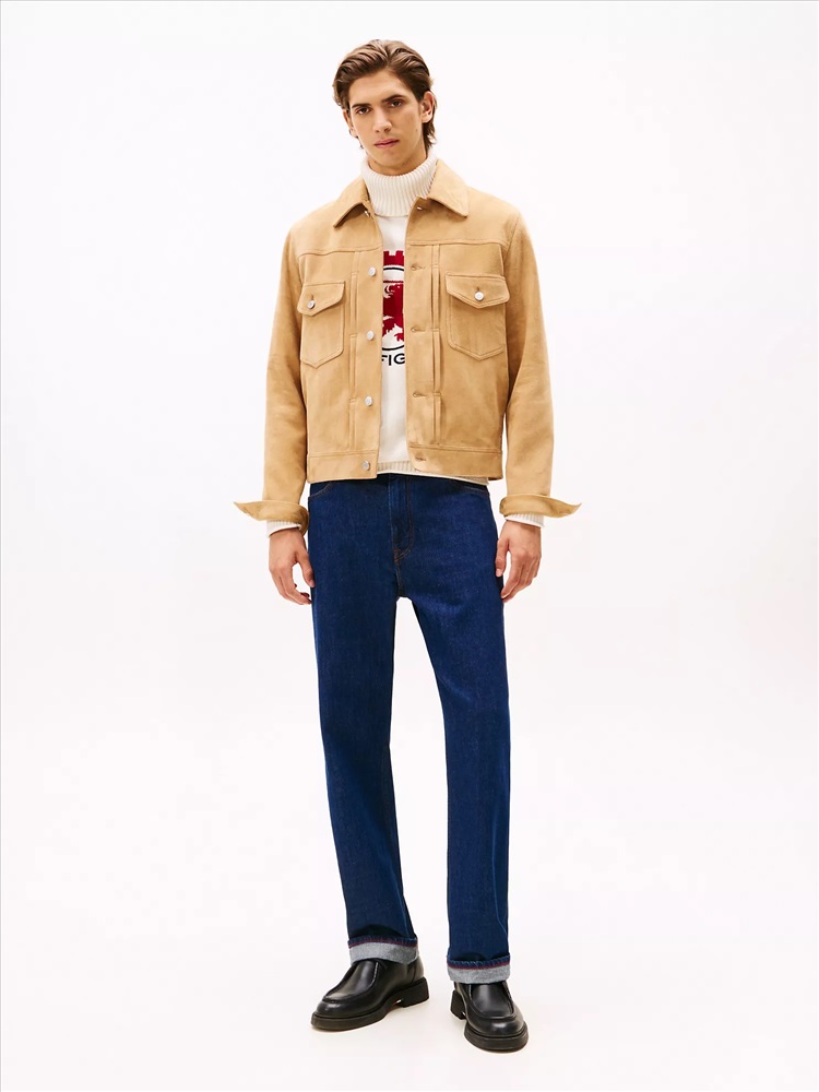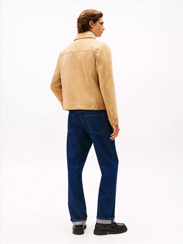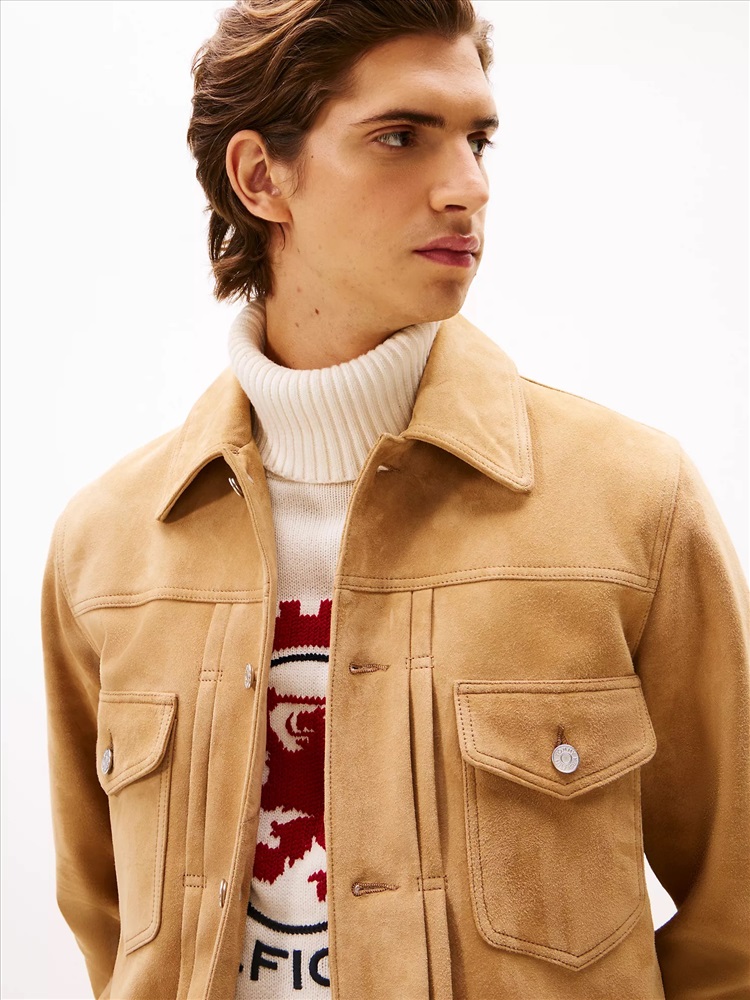 Tommy Hilfiger men's jacket. Switch out your faithful leather jacket for the textural appeal of suede with this timeless trucker silhouette, complete with refined finishing touches like vertical pleats and flap pockets.