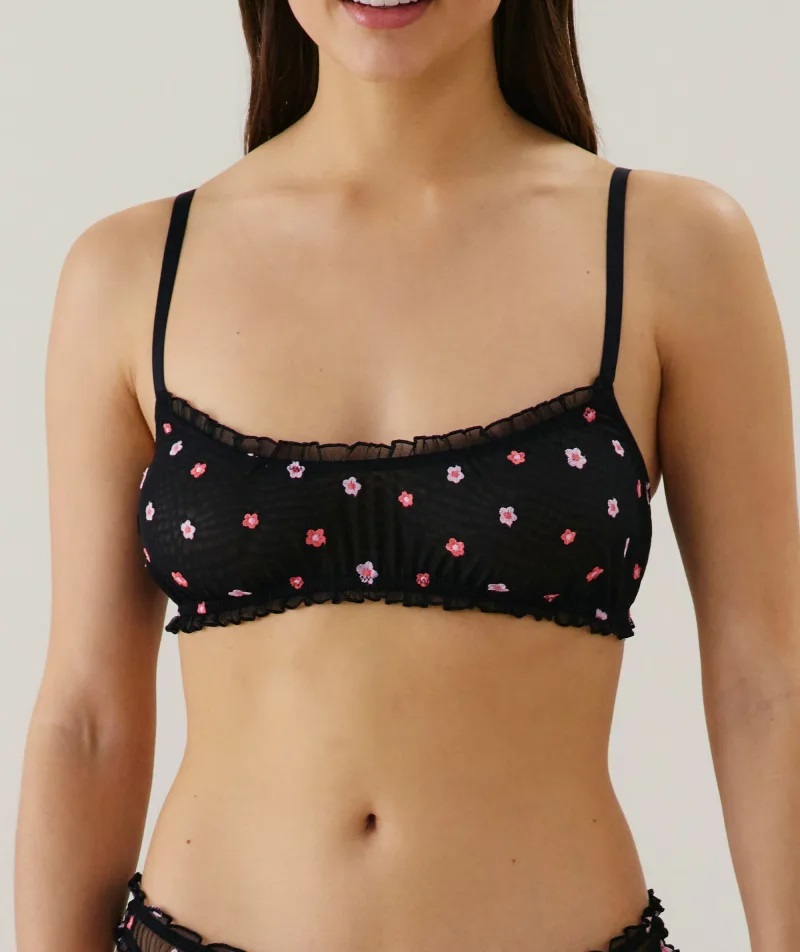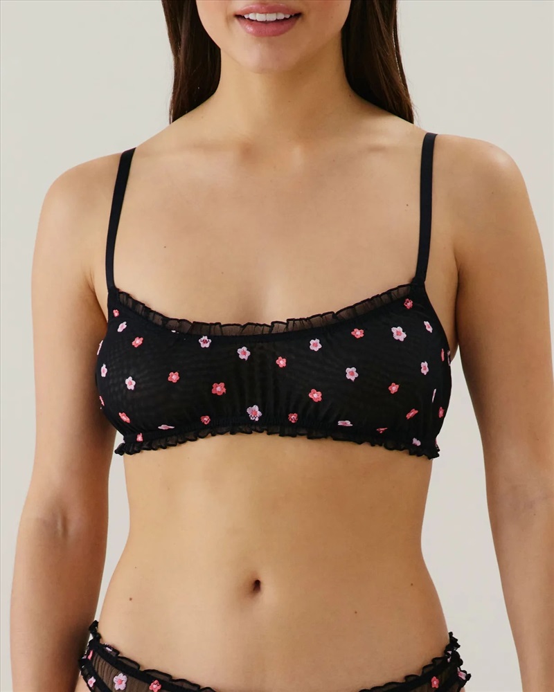Descubre el bralette FIORDALIZ, una pieza delicada y ultra trendy. Confeccionado en tul negro bordado con pequeñas flores de colores, combina transparencia y feminidad para un resultado romántico y atrevido a la vez. Su diseño sin aros garantiza un confort absoluto, mientras que los pequeños volantes en el acabado añaden un toque de suavidad irresistible. Ideal para un look sensual y natural, para combinar con la braga a juego y crear un conjunto armonioso. Además: forma parte de nuestra gama We care.
