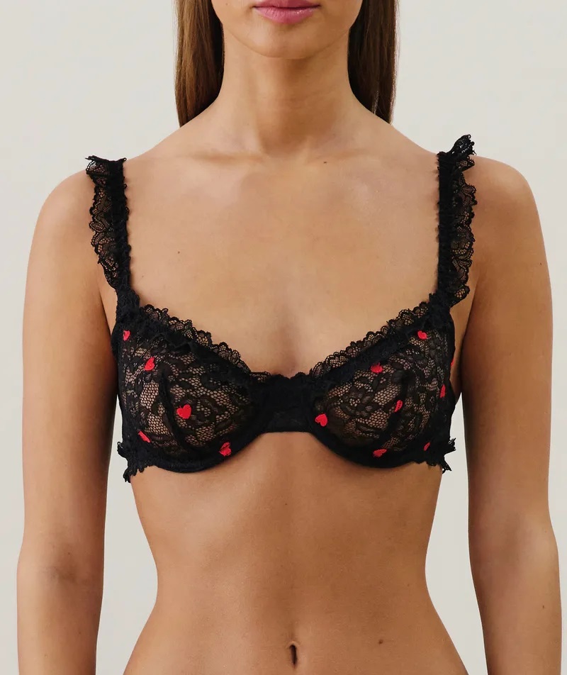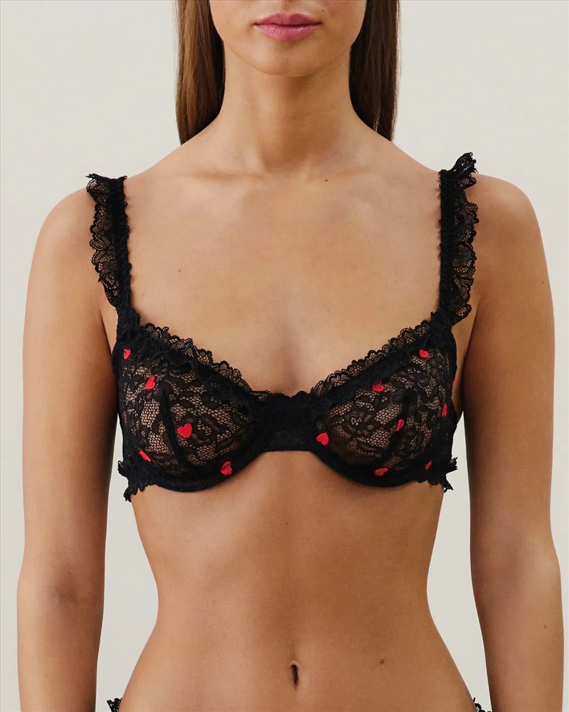 Enamórate del sujetador BRODLACIZ COEURIZ de encaje negro y delicadamente adornado con corazoncitos bordados y volantes de encaje en los hombros y la parte superior del escote. Seguro que te conquistará. Perfecto para celebrar San Valentín. Completa este conjunto con el tanga de la misma colección.