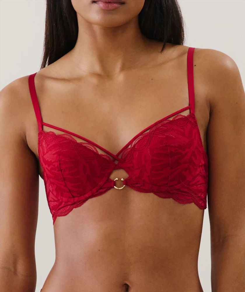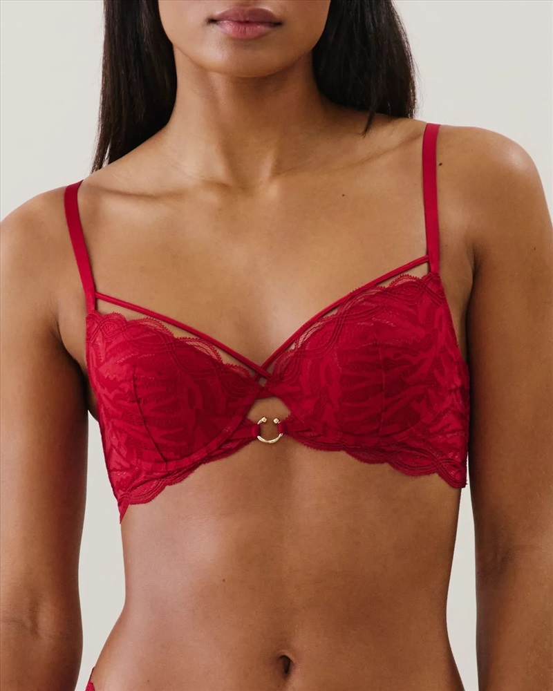 Descubre el sujetador HOTBUTCOMFIZ, un modelo push-up tan sexy como cómodo. Este sujetador rojo de delicado encaje tiene tirantes finos y un detalle entrecruzado en la parte delantera para un efecto elegante y atrevido. Nos encanta el pequeño toque dorado en el centro, que añade un toque de glamour y refinamiento. Perfecto para realzar el escote a la vez que proporciona una sujeción óptima.