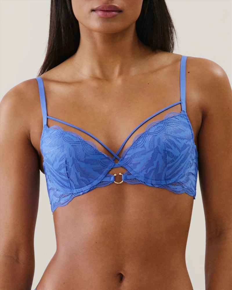 Descubre el sujetador HOTBUTCOMFIZ, un modelo push-up tan sexy como cómodo. Este sujetador azul de delicado encaje tiene tirantes finos y un detalle entrecruzado en la parte delantera para un efecto elegante y atrevido. Nos encanta el pequeño toque dorado en el centro, que añade un toque de glamour y refinamiento. Perfecto para realzar el escote a la vez que proporciona una sujeción óptima.