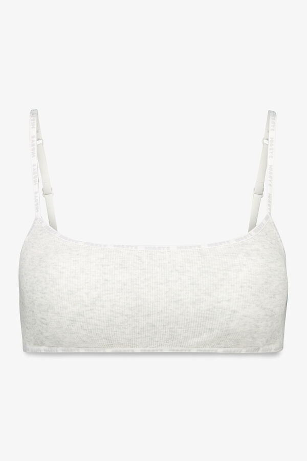 Sujetador top con copas de quita y pon, además con tirantes multiposición. Confeccionado en algodón de canalé con detalle de vivo a contraste, con el logo multiposicionado de HI&BYE.