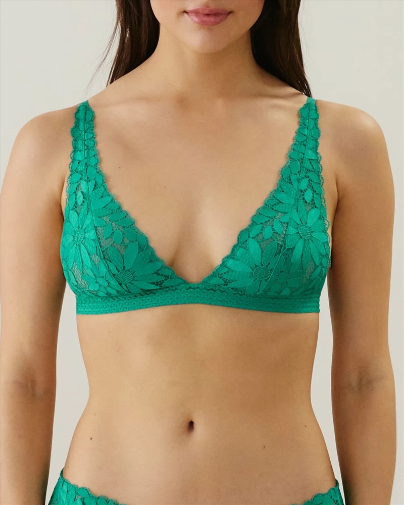 Realza tu escote con el sujetador triangular VERDIZ. Confeccionado en encaje floral de un verde brillante, ofrece un efecto natural que realza el pecho. Además: forma parte de nuestra gama We care.